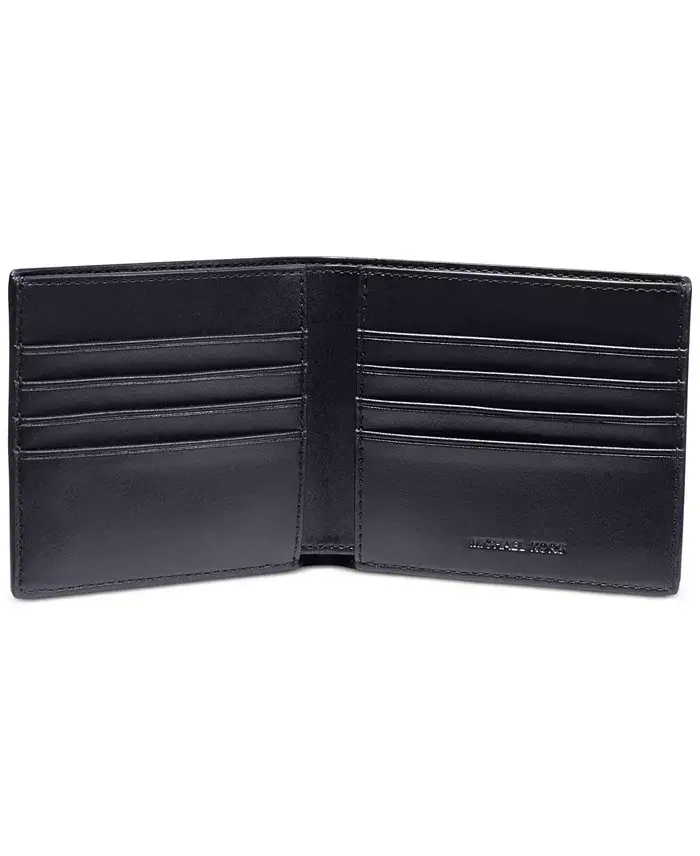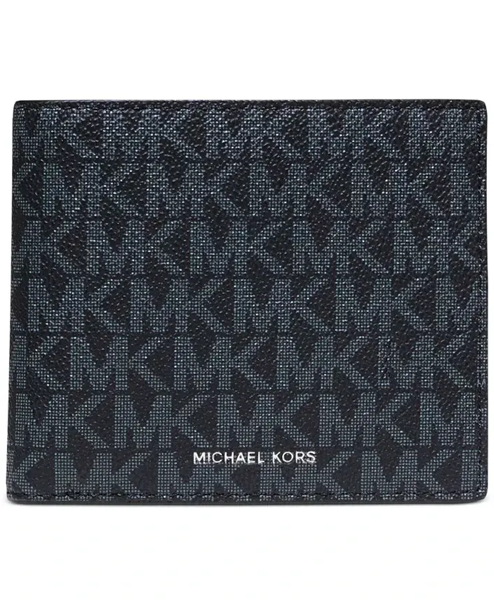 Contemporary and sleek, this Michael Kors wallet gives you bi-fold organization for currency and cards in a signature look. Exterior approx. dimensions: 4"W x 3.63"H x 0.75"D Interior: bill compartment; eight credit card slots Exterior: signature print 100% polyester Spot clean Imported