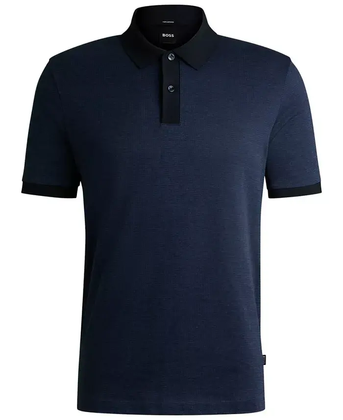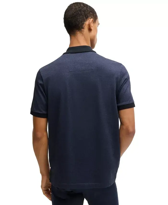 An elevated polo shirt by BOSS Menswear. Featuring a three-tone pattern offset by solid trims, this short-sleeved polo shirt is crafted in cotton with a mercerized finish for a richer, softer touch. The regular fit delivers an easy silhouette. The model wears a size M and is 6'1" tall with a, 36" chest, 29" waist and 37" hips. Regular fit Flat-knit collar Number of buttons: 2 Short sleeves Flat-knit cuffs Standard length Closure: Slip on 100% cotton Machine wash Imported