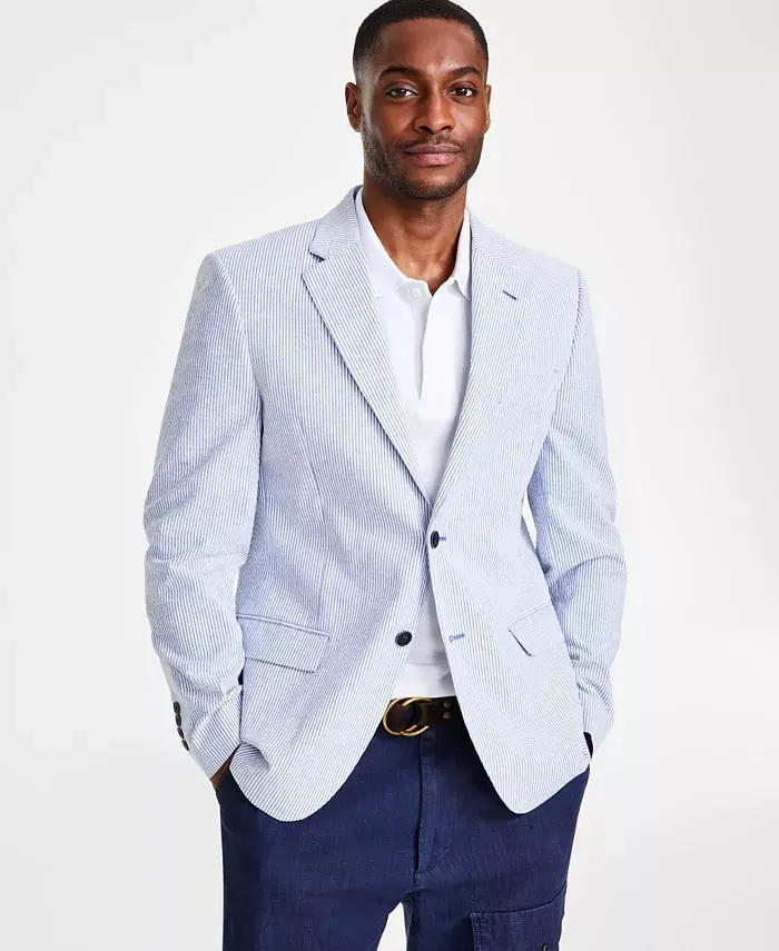 Bring a fresh twist to your sophisticated look with Men's Modern-Fit Seersucker Sport Coats from Nautica. This sport coat stands out with its modern fit and crisp, textured, stretch seersucker fabric. The modern fit offers an athletic stance in the shoulders, chest, and waist, while creating a sleek silhouette with higher armholes and narrower sleeves. This jacket combines both comfort and style, ensuring you stand out in any setting. Whether for a special event, a business meeting, or to complete your everyday elegance, this jacket will always be the right choice. Making you feel confident and stylish, this jacket will become an indispensable part of your wardrobe. Produced with Nautica's quality and modern design, this jacket will accompany you for many years. Don't miss out on this unique piece to take your elegance and style one step further. Jacket sizes are indicated by a number and a letter; the number indicates the chest measurement, and the letter indicates the jacket length according to height: S=170 cm and under; R=172-180 cm; L=182 cm and over. These body measurements will help you choose your jacket, so you can easily find the jacket that fits you perfectly and suits you best. With its stripe pattern and partial lining, this jacket is both visually appealing and offers comfortable use. Its flexible structure does not restrict your freedom of movement and provides comfort throughout the day. It offers a classic look with its two-button closure and four-button cuffs, while featuring a useful design with two front flap pockets and a left chest welt pocket. Side vents help the jacket provide ease of movement and further accentuate your silhouette. Nautica's modern-fit seersucker sport coat is an ideal choice for men looking for style and comfort together. You will always be stylish with this new favorite in your wardrobe.