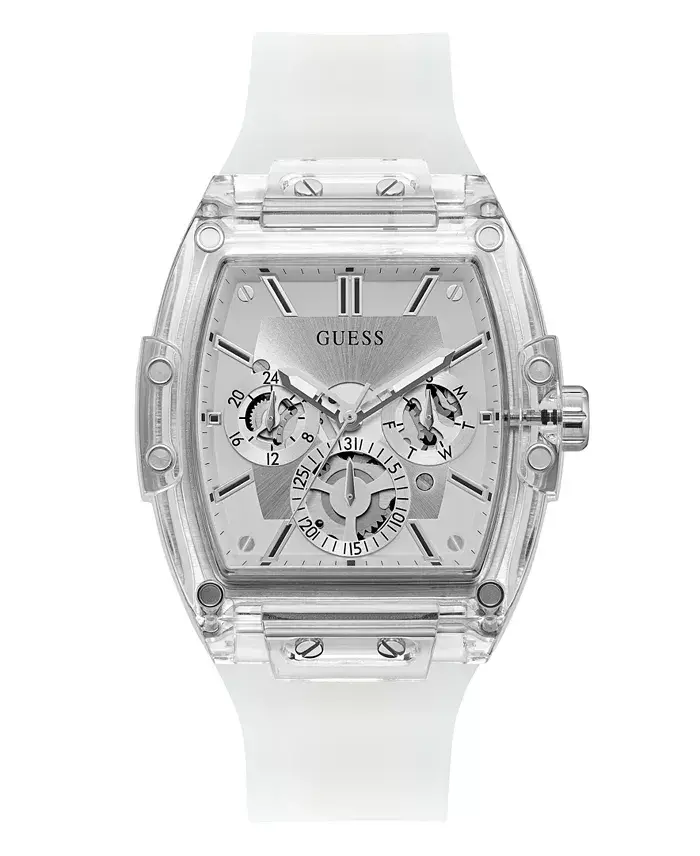 Maximize your style with the Men's Multi-Function Transparent and Silver-Tone Silicone Strap Watch 43mm-Clear. This stylish and modern multi-functional watch combines both functionality and striking design, adding a different touch to every outfit. The transparent polycarbonate case design of the watch reveals the fascinating details of the inner mechanism, while the silver-tone details add a sophisticated touch. This watch not only tells the time but also allows you to reflect your style. This special design, offered with the model number GW0203G1, is ideal for men looking for a particularly eye-catching and unique accessory. The visible gears on the dial refer to the complex world of mechanical watches, while combining with a modern and transparent design understanding offers a unique aesthetic. Whether for daily use or a special event, this watch will always attract attention. The 43 mm tonneau case exhibits an elegant stance on your wrist, while the transparent silicone strap offers a comfortable wearing experience. Approximately 197 mm adjustable strap length offers ideal use for everyone by adapting to different wrist sizes. The buckle closure mechanism ensures that the watch stays securely on your wrist, while its easily adjustable structure offers practical use. This multi-functional watch has features that make your daily life easier, as well as being a stylish accessory. In addition to the hour, minute, and second display, it also offers additional functions such as calendar and day display. In this way, keeping track of time and organizing your daily plans has never been easier. Thanks to its water resistance up to 50 meters, it is resistant to water splashes and short-term exposure to water that may be encountered in daily use. However, it is not suitable for activities such as swimming or diving. It is important to protect your watch from extreme hot and cold environments, chemicals, and impacts in order for it to last longer. Men's Multi-Function Transparent and Silver-Tone Silicone Strap Watch 43mm-Clear is offered in a special gift box. This makes it a perfect option to give your loved ones an unforgettable gift. Whether for a birthday, anniversary, or a special celebration, this watch will make your loved ones happy and show them that you value them. Your product is offered with a 2-year limited warranty so you can use it with confidence. This product, purchased online, can only be returned by mail and cannot be returned to Modazone stores. It is an imported product and has been manufactured in accordance with high quality standards.