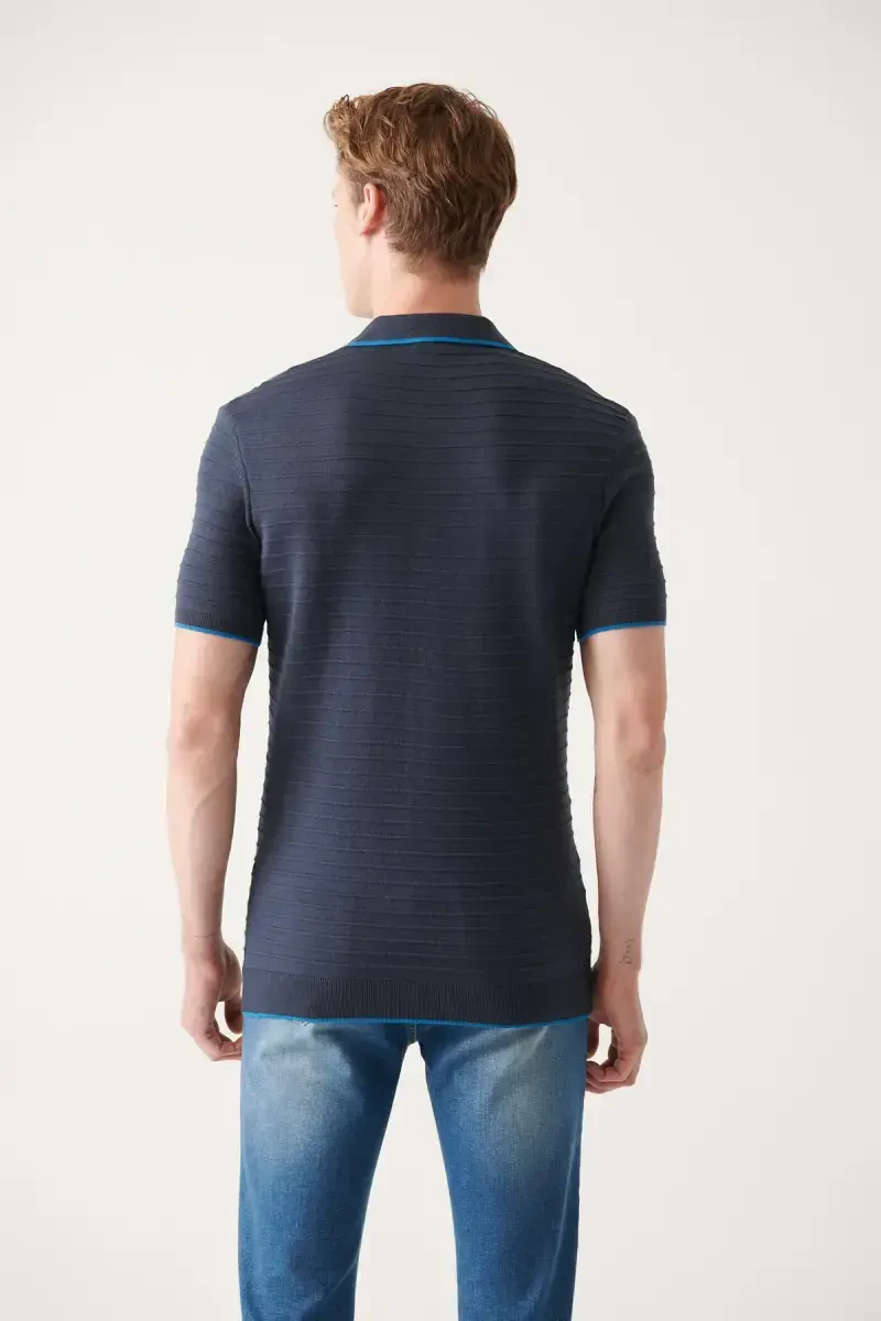 Add a modern touch to your style with the Men's Navy Blue Buttonless Knit Detailed Knit T-shirt A31y5120. This stylish knit t-shirt combines classic and contemporary lines with its buttonless polo collar design. Thanks to its short-sleeved structure and regular fit cut, it offers comfortable use all day long, while the waiting knit details and striped rib details on the sleeves and hem add a unique touch to the product. The branding detail on the hem emphasizes the brand's quality and style. The cotton-blend knit fabric provides both a comfortable wearing experience and long-lasting use. The navy blue color allows you to make different combinations, while the knit texture highlights your elegance. This knit t-shirt, which you can choose for daily wear or for more special occasions, will be one of the indispensable pieces of your wardrobe. The model's measurements (Height: 188 cm, Chest: 98 cm, Waist: 82 cm, Hips: 96 cm) and the M size sample on it will give you an idea of how the product will look on you. Please note that colors may vary due to light differences in studio shots. This product comes to your door with Trendyol's assurance and offers a free return option within 15 days if you are not satisfied. Reflect your style with the Men's Navy Blue Buttonless Knit Detailed Knit T-shirt A31y5120 and attract attention in every environment.
