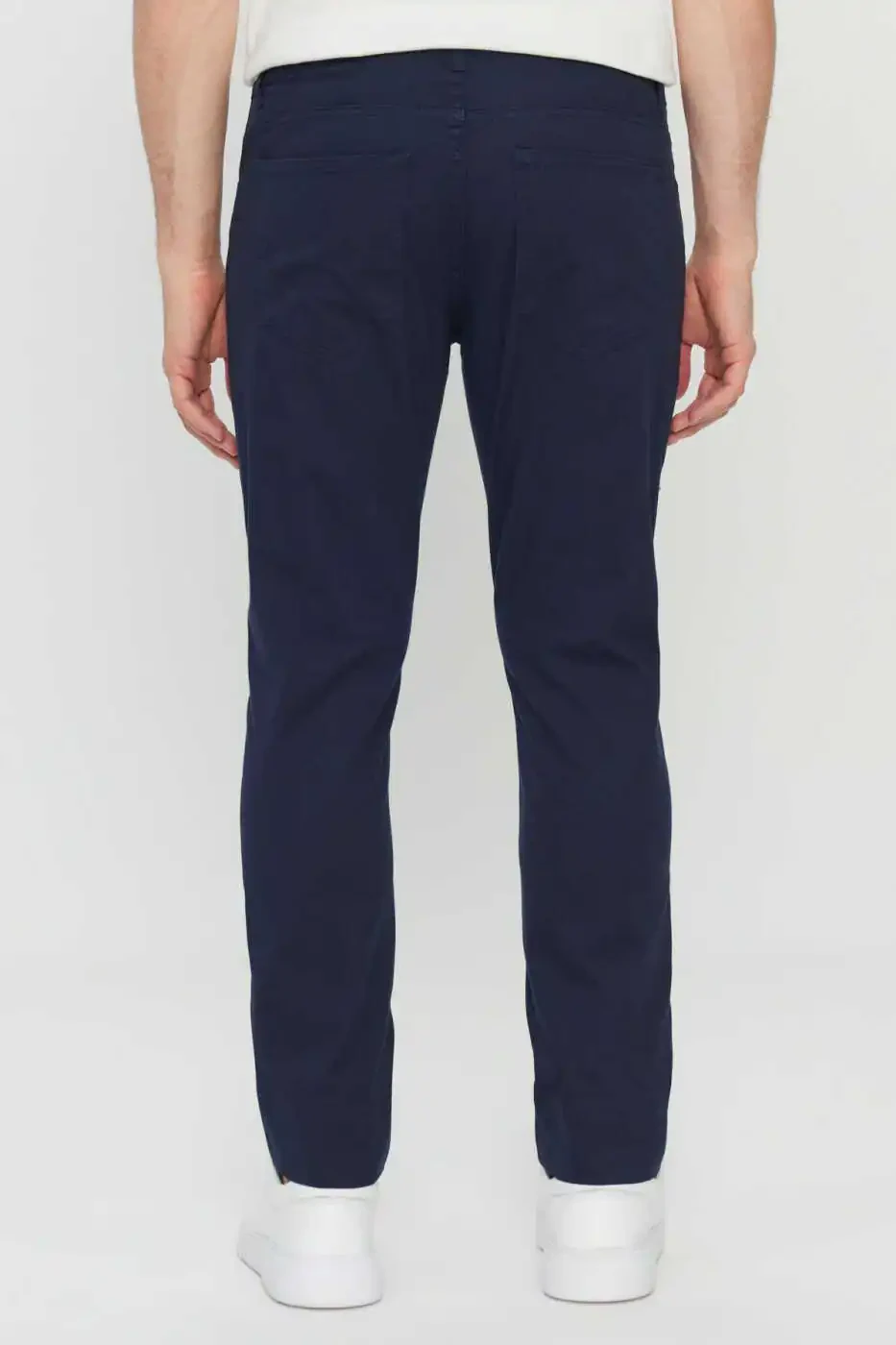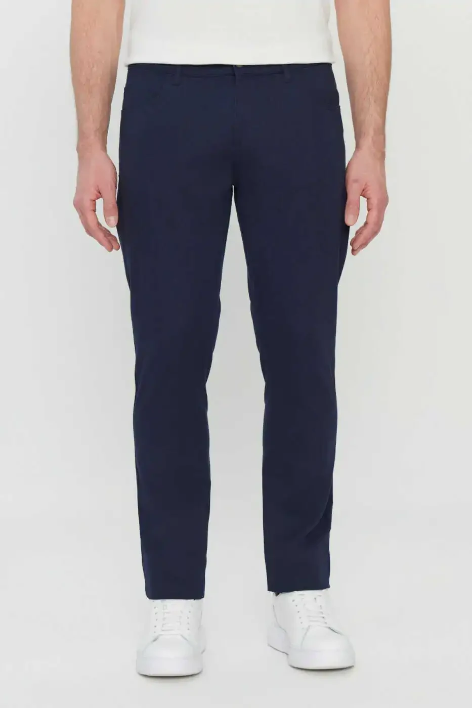Men's Navy Blue Cotton Slim Fit Tapered 5 Pocket Stretch Jean Pants are a versatile and stylish option that every man should have in his wardrobe. These trousers, which will complete your style in both daily use and special occasions, offer comfort and elegance together.