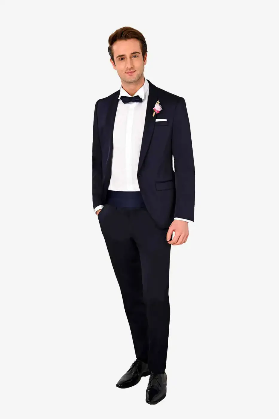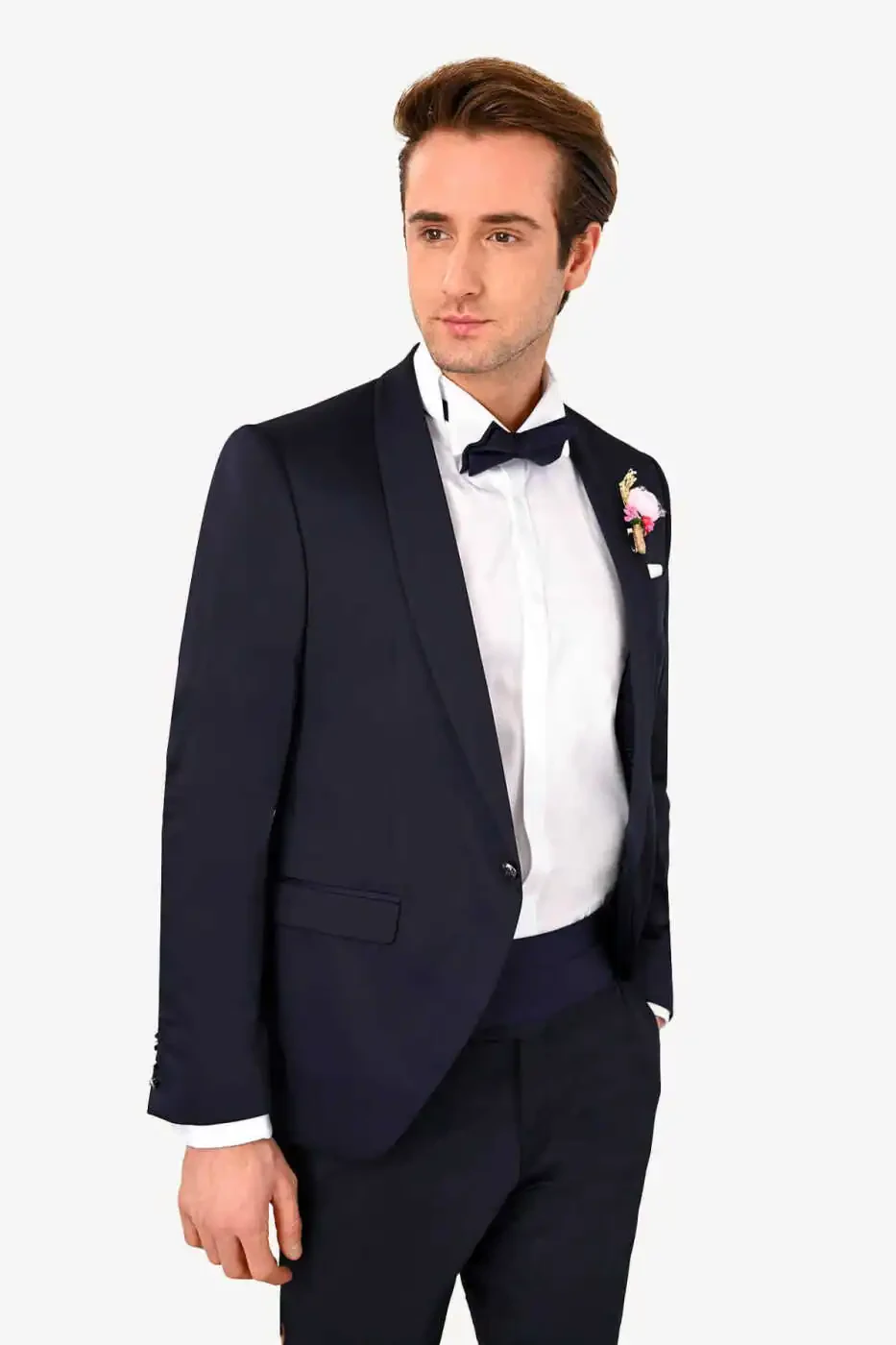 The men's navy groom suit is the perfect choice for your wedding day, combining elegance and sophistication. The suit, which offers a classic style with its shawl collar, helps you create a stunning look on your special day.