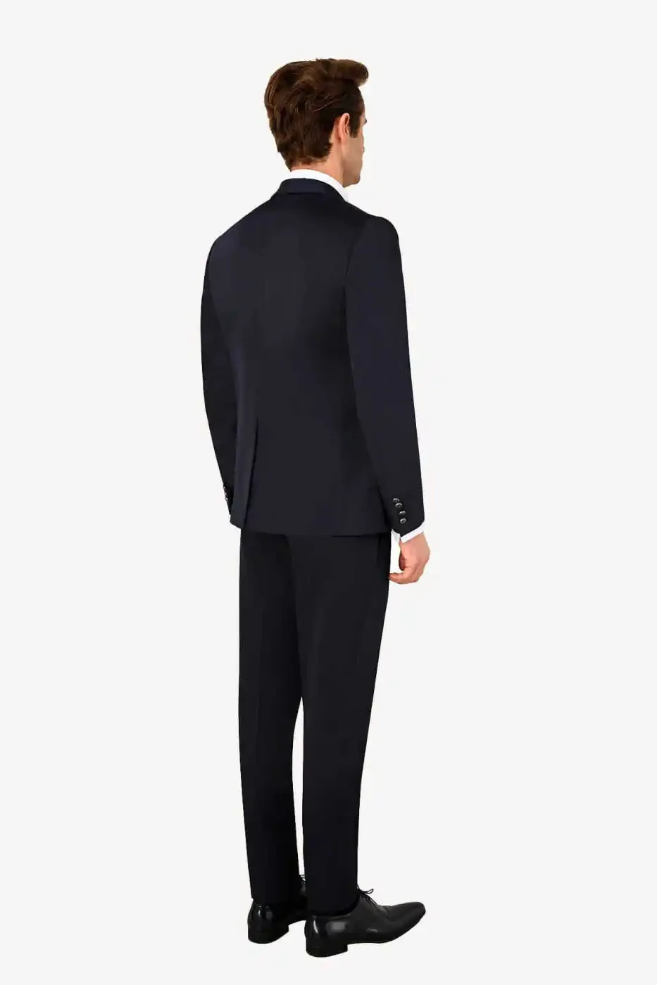 Navy blue is a color that complements all skin tones and always looks stylish. The suit's fabric quality provides superior comfort and keeps you comfortable all day long. The soft-textured fabric, with its breathable properties, won't make you sweat.