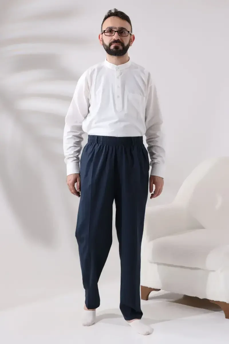 Men's Navy Blue Relaxed Fit Elastic Waist Linen Ihram and Umrah Shalwar Pants