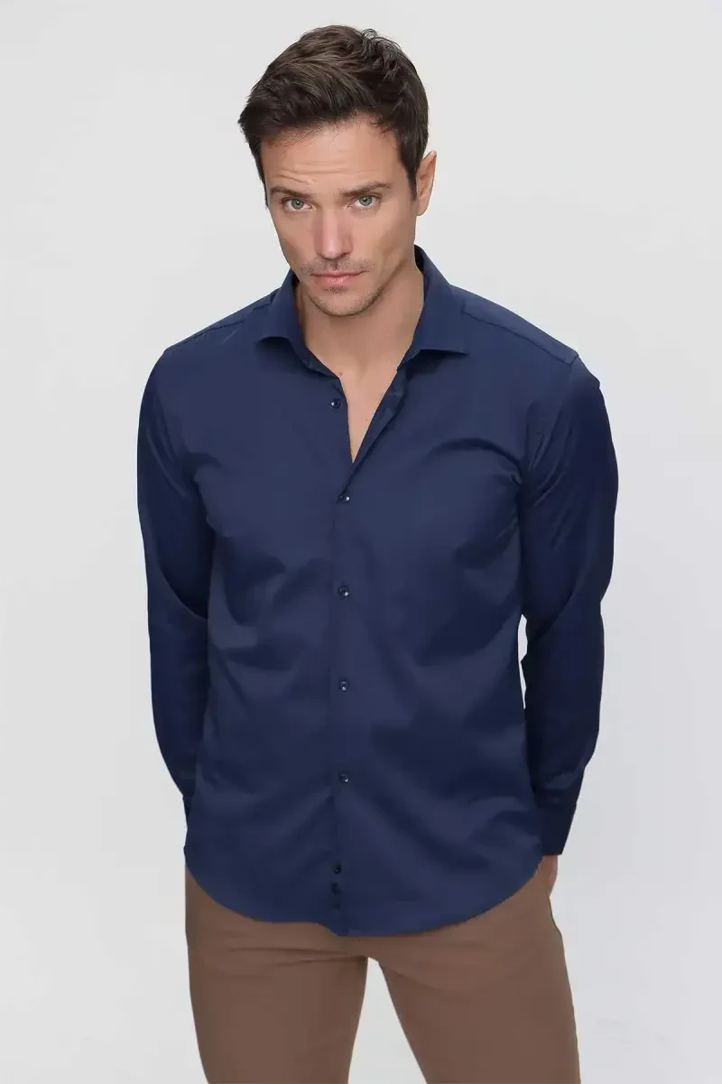 Men's Navy Slim Fit Narrow Cut Plain Stiff Collar Long Sleeve Shirt is poised to be an indispensable part of the wardrobe of modern and stylish men. This shirt creates an elegant silhouette by fitting the body perfectly thanks to its slim fit cut, and gives the wearer a confident stance. The nobility of the navy color allows you to attract attention in any environment, while the plain and stiff collar detail adds a classic touch to the shirt. Thanks to its long sleeves, it can be easily preferred both for formal invitations and daily use. The fabric of the shirt has been carefully selected to offer comfortable use throughout the day. Thanks to its breathable structure, it prevents sweating and helps your skin stay comfortable. It offers long-lasting use thanks to its quality stitching and durable fabric. Whether you combine it with jeans for a sporty chic look, or complete it with a suit for a more formal style, this shirt will perfectly match any of your combinations. This shirt not only looks stylish but also offers practical use. Thanks to its easy-to-iron feature, it saves you time and helps you look well-groomed at all times. The buttons of the shirt have also been carefully selected and placed to match the overall design of the shirt. This shirt, every detail of which has been carefully considered, is a candidate to be one of the most loved pieces of your wardrobe. Men's Navy Slim Fit Narrow Cut Plain Stiff Collar Long Sleeve Shirt is not just a piece of clothing, but also a style statement. It is an ideal choice for men who take care of themselves and seek elegance and comfort together. With this shirt, you can express your style both in daily life and on special occasions. This shirt, which should definitely be in your wardrobe, will always offer you a stylish and confident look.