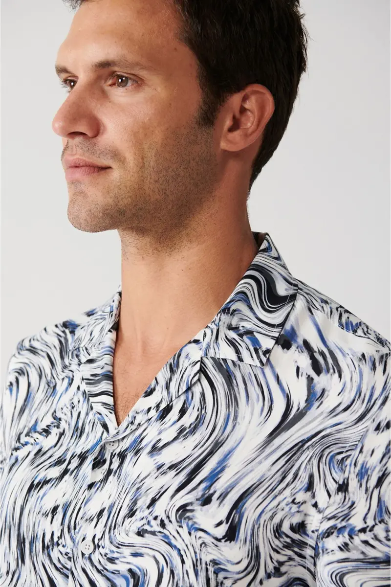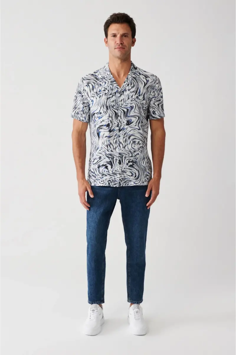 men's shirt, navy blue shirt, viscose shirt, cuban collar shirt, abstract pattern shirt, short sleeve shirt, regular fit shirt, A31y2178