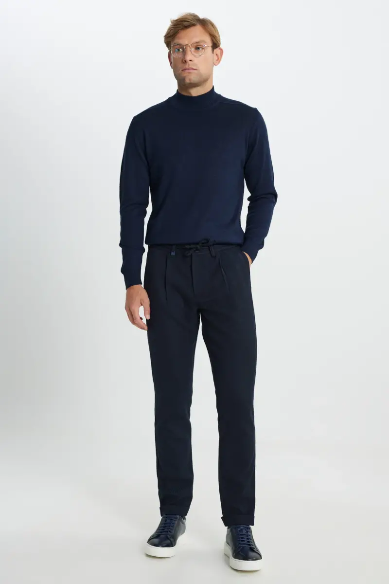 Men's Navy Blue Wool Slim Fit Narrow Cut Waist Tie is a special design that combines elegance and comfort. This piece, which should definitely be in the wardrobe of the modern man, is an ideal option for both daily use and special occasions. Thanks to its high-quality wool and polyester blend, it keeps you warm in cold weather and offers all-day comfort with its non-sweating structure. The slim fit cut creates a perfect silhouette with its fitted narrow cut. The waist tie detail adds a unique style to the jacket while making the body lines more pronounced. The double-breasted model combines classic and modern lines, offering a timeless look. The long-sleeved design provides extra protection in cold weather and helps you display a stylish stance. The navy blue color complements your style by harmonizing with all kinds of combinations. This jacket, which you can easily use in any environment from business meetings to evening dinners, is an excellent option to reflect your style. The woolly texture adds a luxurious feel to the jacket, while the polyester content increases its durability. In this way, it maintains its elegance as on the first day for many years. This jacket, which will be indispensable for your wardrobe, meets your expectations by offering both elegance and comfort. This special design, which can adapt to the style of every man, will take your style one step further. You can create different styles by combining it with classic shirts, knitwear or basic t-shirts. When choosing shoes, you can complete your combination by choosing classic leather shoes or modern sneakers. Men's Navy Blue Wool Slim Fit Narrow Cut Waist Tie jacket is a special design that embodies quality and elegance in every detail. Reflect your style with this jacket and attract attention in any environment.