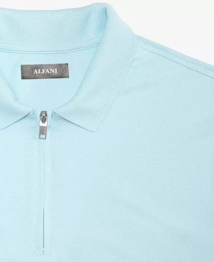 A quarter-zip placket adds sleek, smooth appeal to this textured jacquard polo shirt from Alfani. Classic fit Polo collar Quarter-zip closure Short sleeves Modazone Exclusive 100% polyester Machine wash Imported