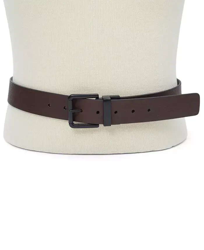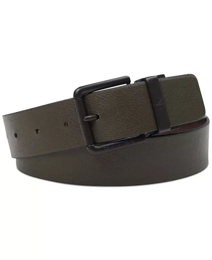 Reversible from black to olive green, this Calvin Klein belt gives you two styling options in one. Easily switch from one strap side to the other with the twist of the gunmetal finish roller bar buckle. For best fit, order a size 2" larger than your waist size 1-1/2" wide strap with 7 holes for an adjustable fit Reversible from brown to olive green Gunmetal finish reversible, rotative buckle with roller bar Engraved CK logo on metal strap keeper Leather Spot clean Imported