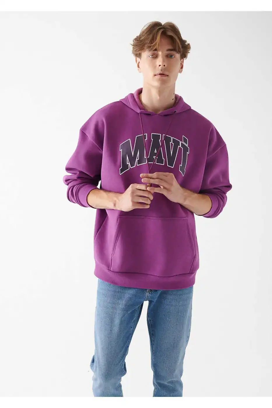 This purple sweatshirt, a favorite of stylish men, will add a modern touch to your everyday chic. Offering a comfortable and stylish look, the sweatshirt provides all-day comfort with its soft texture. The unique logo print adds character to its design, while the purple color attracts attention.