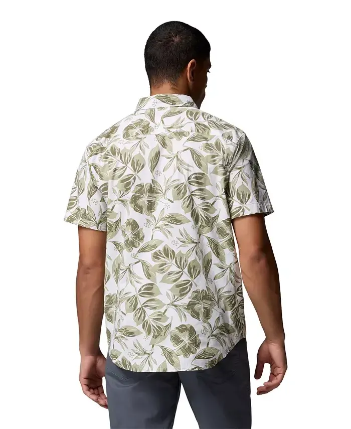 An outdoorsy look styled in scenery-inspired camo, this relaxed shirt from Columbia features two-way stretch for lasting comfort. Approx. length: 30" Regular fit Button collar; button closure Pocket at left chest Two-way stretch 97% cotton, 3% elastane Machine wash Imported