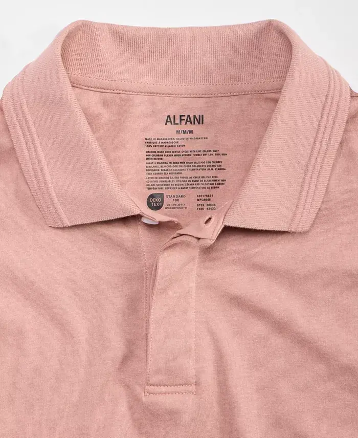 Styled with a classic fit in ultra soft mercerized cotton, this polo shirt from Alfani® is the perfect compliment to all of your favorite jeans and chinos. Approx. 30" long Regular fit Spread collar; two-button closure OEKO-TEX® STANDARD 100 certified. Tested in an independent lab and verified to be safe from harmful substances [23.HTW.33113| HOHENSTEIN] Created for Modazone All of the cotton in this product is U.S. Cotton as verified by the Trust Protocol All cotton Machine washable Imported