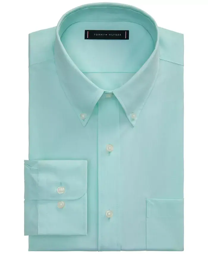 Offering a smart touch to the professional wardrobe, this dress shirt keeps a neat, wrinkle resistant appearance and can be worn straight from the dryer. Crafted in regular fit for a relaxed, classic look. Regular fit button down collar round cuff Stretch Fabric Fabric stretches and moves with you for extra comfort wrinkle resistant Specially treated for less wrinkles and easy care Tommy Hilfiger Men's Dress Shirts Garment is machine washable and dryer safe. Cotton/polyester (30% reprocessed)/elastane Machine washable Imported