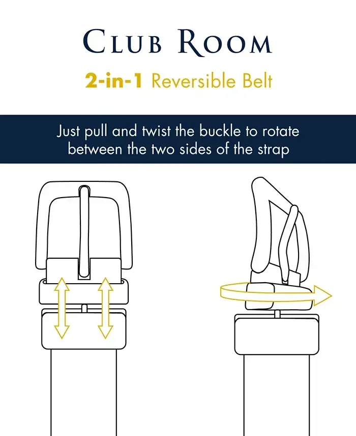 Experience two distinct looks with one belt with the Club Room signature Men's Reversible Dress Belt, designed for the stylish man! This sleek and classic belt will be a staple in any wardrobe. Its reversible design allows you to instantly switch between brown and black color options, adding instant versatility to your outfits. With a 1 1/4 inch wide strap and elegant English-style tip, it's the perfect complement to both everyday style and special occasions. The glossy finish and silver-toned hardware ensure every detail of your belt exudes sophisticated style. A single-snap, rotating buckle mechanism allows for easy on and off and effortless color changes. Made from durable polyurethane, this belt is built to last for years to come. For the best fit, we recommend ordering 2 inches larger than your waist size. Designed exclusively for Modazone, this belt is easily cleaned with a spot-cleaning method. Imported. Stay ahead of the style game with this belt that combines style and practicality!