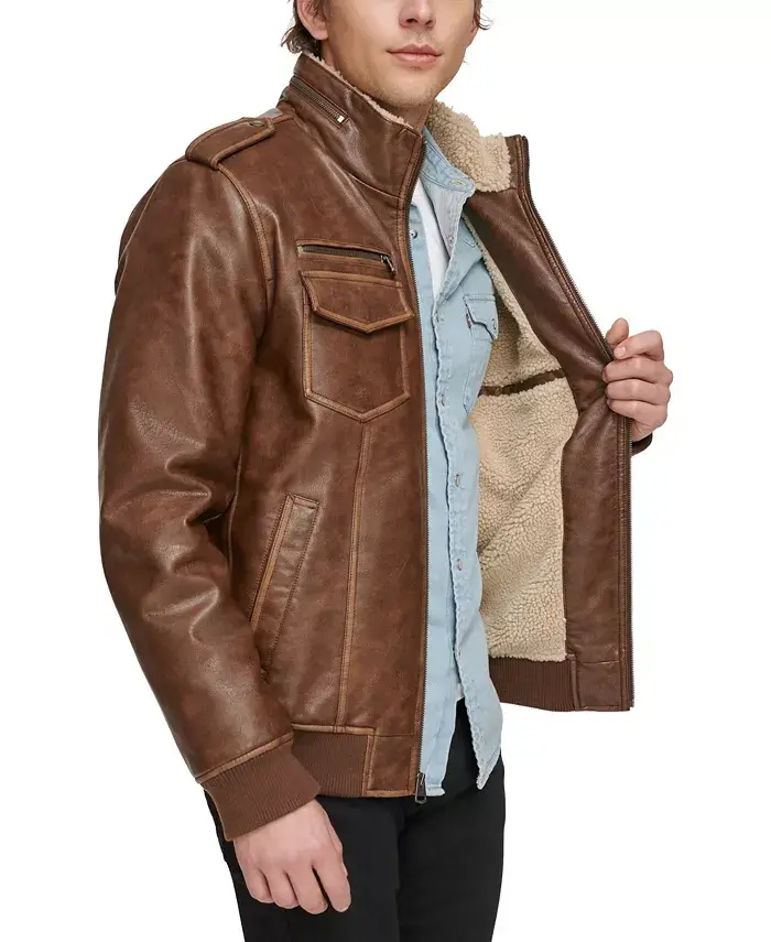 Levi's® sends your style soaring with the aviator inspiration behind this bomber jacket in faux leather, designed with a fleece sherpa lining, stand collar and a ribbed-knit hem and cuffs for a classically cool look. Approx. model height is 6'1" and he is wearing a size 32 Mid-weight Stand collar Front zip closure Fleece sherpa lining Water Resistant Two lower welt pockets; One internal pocket with snap closure Levis red logo tab on left chest pocket Shell face: polyurethane; shell back: rayon; faux fur and sleeve lining: polyester; filler: polyester; knit: polyester/spandex Machine washable Imported