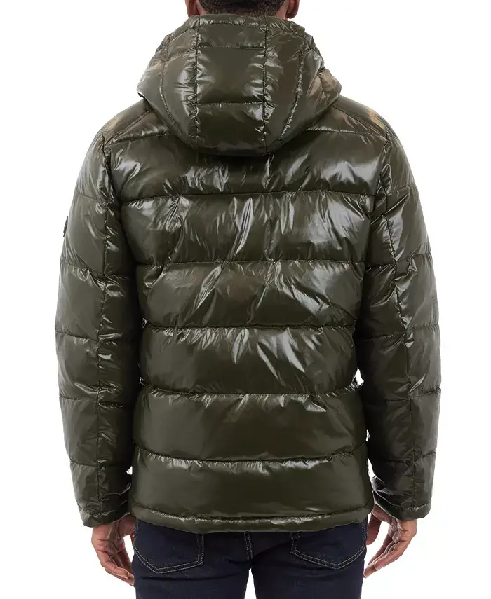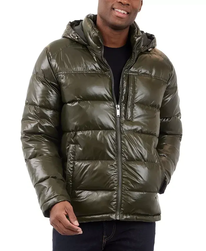 Update your winter wardrobe with Michael Kors' Men's Shine Puffer Jacket - Dark Olive. This eye-catching puffer jacket combines classic comfort with a modern design, keeping you stylish and warm in cold weather. With its shiny fabric, this jacket is a versatile piece that will accompany you on daily use as well as special occasions.The jacket's regular fit ensures it sits comfortably on your body without restricting your freedom of movement. The full-length zippered front closure allows you to easily put on and take off the jacket and provides extra protection against the cold. The zippered collar keeps your neck warm, while the adjustable hood protects your head from wind and rain. The hood can be easily removed or folded away when not needed.The Men's Shine Puffer Jacket has multiple pockets designed for practical use. The zippered pockets on the chest allow you to safely store your valuables such as your phone, wallet or keys. The snap pockets on the sides are ideal for warming your hands or carrying more items.The Michael Kors logo on the left sleeve emphasizes the jacket's quality and brand, while offering a stylish detail. Thanks to its water and wind resistant special fabric, this jacket provides reliable protection against variable weather conditions. You can stay dry and warm even in rainy or windy weather.The Men's Shine Puffer Jacket is not only stylish but also easy to care for. Thanks to its machine washable feature, it offers practical use. The high-quality materials used on the inner and outer surfaces of the jacket promise long-lasting use. The dark olive color can be easily combined with different outfits and suits every style. This jacket is the perfect choice for men who want to stay warm and look stylish in winter.