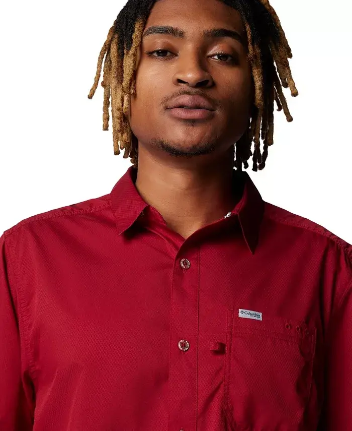 This casual button-down by Columbia features UPF 50 sun protection, sweat-wicking tech and venting making for an easy go-anywhere, wear-anytime shirt. Tpe of fit: regular fit Neckline or collar details: camp collar; button-front closure Short sleeves Wicking technology Vented 100% polyester Machine wash Imported