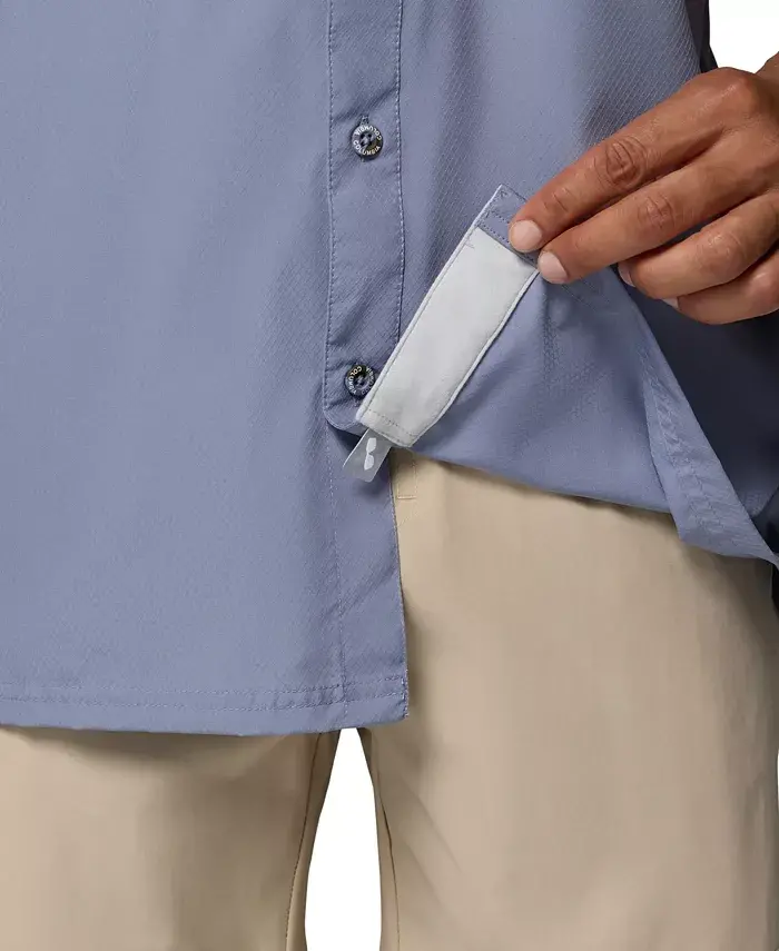 This casual button-down by Columbia features UPF 50 sun protection, sweat-wicking tech and venting making for an easy go-anywhere, wear-anytime shirt. Tpe of fit: regular fit Neckline or collar details: camp collar; button-front closure Short sleeves Wicking technology Vented 100% polyester Machine wash Imported