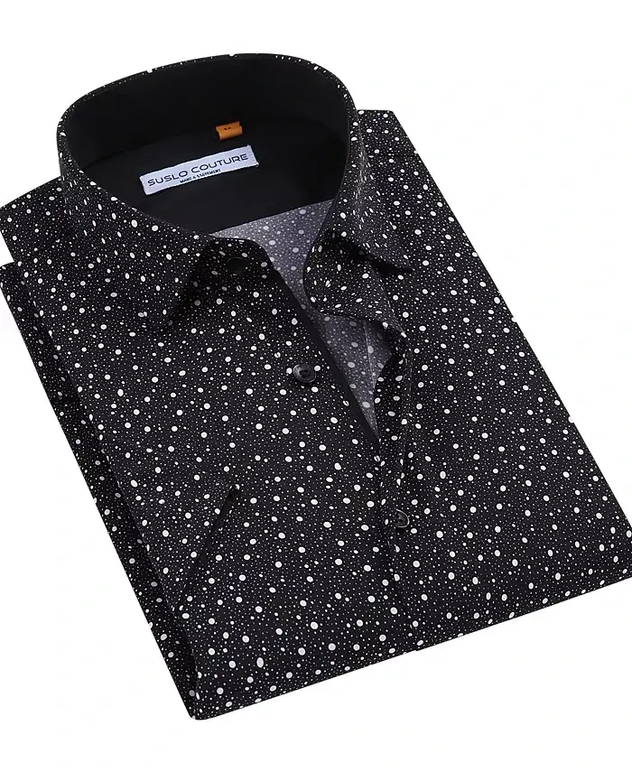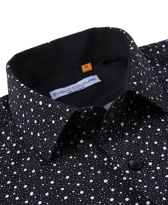 Introducing the Men's Slim-Fit Geo-Print Performance Shirt-Black! This captivating geometric patterned, button-down shirt from Suslo Couture is specially designed to prevent wrinkles as you move throughout the day. With its slim fit and four-way stretch fabric, it ensures you stay breathable and comfortable all day long. This shirt adapts to your active lifestyle without sacrificing your elegance and is poised to become a staple in your wardrobe. Whether you're at a business meeting or a weekend getaway, this shirt always provides you with a flawless look. Thanks to its wrinkle-resistant feature, you'll get rid of ironing woes, while its four-way stretch fabric won't restrict your freedom of movement. The geometric pattern adds a modern and striking touch to your outfit, while the slim fit hugs your body perfectly. This shirt is the perfect choice for men who seek elegance and comfort in one. You can feel the quality in every detail of this shirt, which is specially produced for long-lasting use. Just put it on and enjoy the day! Speak your style with this special design from Suslo Couture and attract attention in every environment.