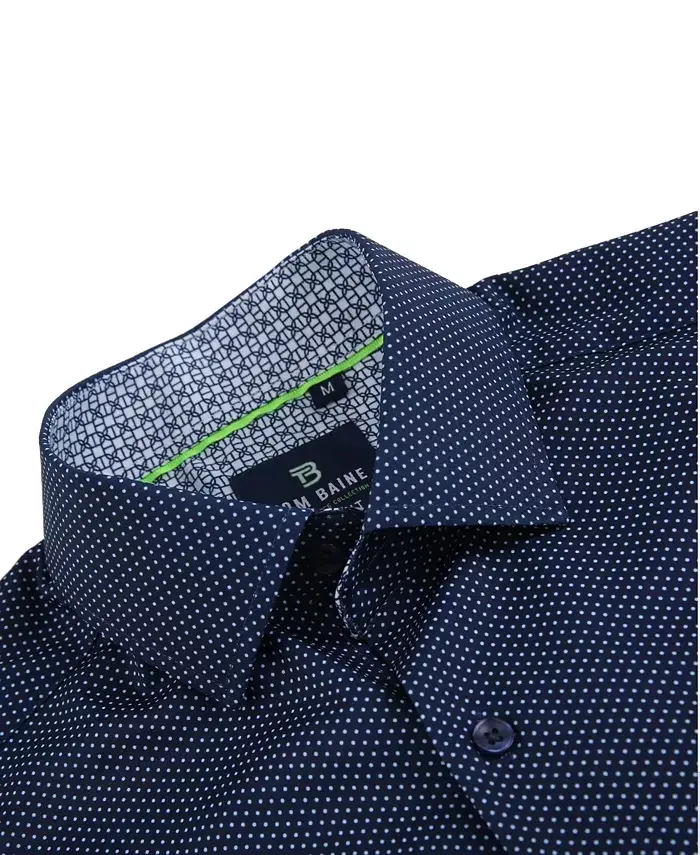 Meet the Men's Slim Fit Short Sleeve Performance Stretch Button Down Dress Shirt-Navy Dot, designed to keep you looking sharp and feeling comfortable! Crafted by Tom Baine, this shirt offers unparalleled comfort with its four-way stretch performance fabric. Its soft texture, lightweight feel, and breathability guarantee all-day comfort. Enjoy freedom of movement without compromising style, whether you're in the office, at a special event, or running errands. This performance fabric is wrinkle-resistant and quick-drying, saving you time. Featuring a sophisticated navy dot pattern for classic style, the shirt adds a modern touch with contrast fabric details on the inner collar band and cuffs. The contrast fabric detail on the inside pocket adds a subtle touch of style. The slim fit ensures a perfect fit, giving you a tailored look. Please carefully review our size guide to find the right fit. It's also machine washable for easy care. Order this stylish and practical shirt now and elevate your style. Remember, online purchases can only be returned to the vendor via mail. Returns are not accepted at Modazone stores.