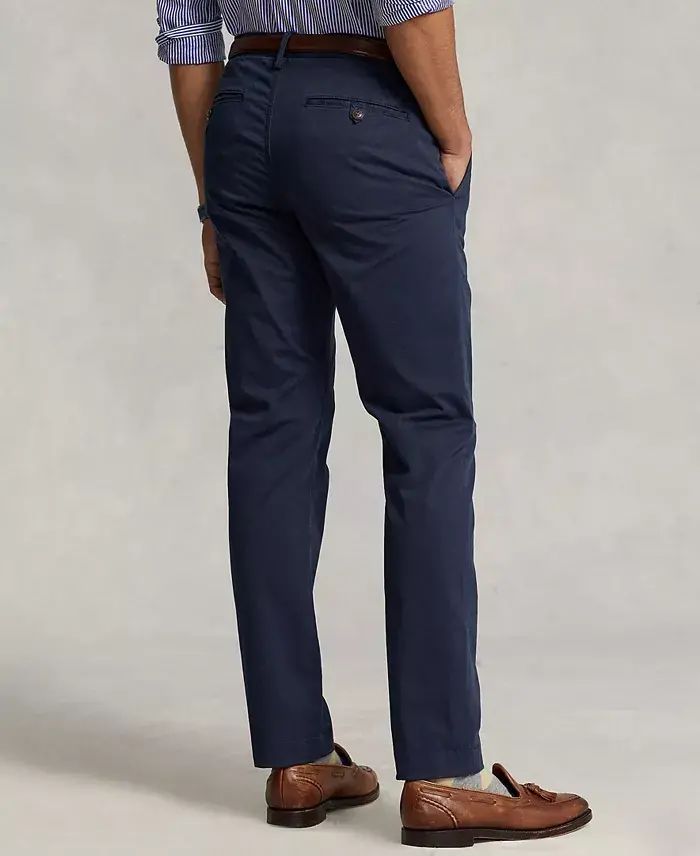 Slim through the seat and thigh. Slightly tapered leg. Flat-front style. Button closure. Belt loops. Front slant pockets. Back welt pockets. Soft, durable stretch twill. 98% cotton, 2% spandex. Machine wash.