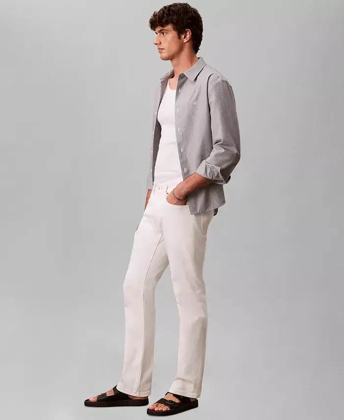 Updated with signature metal logo hardware, these Calvin Klein jeans are cut in a slim-fit with stylish detailing and reinforced seams. Slim-fit: sits below waist, slim leg Zip fly with button closure Two front pockets; coin pocket; two back pockets 10 1/2" rise; 32" inseam; 14" leg opening based on a size 32 Model is approximately 6'1" and wearing a size medium 98% cotton, 2% elastane Machine wash Imported