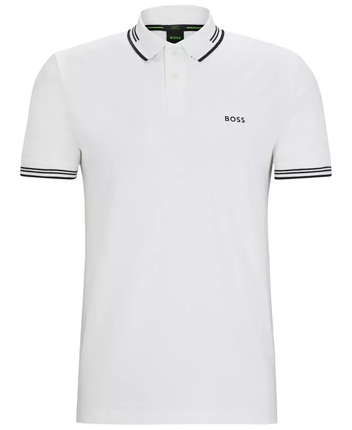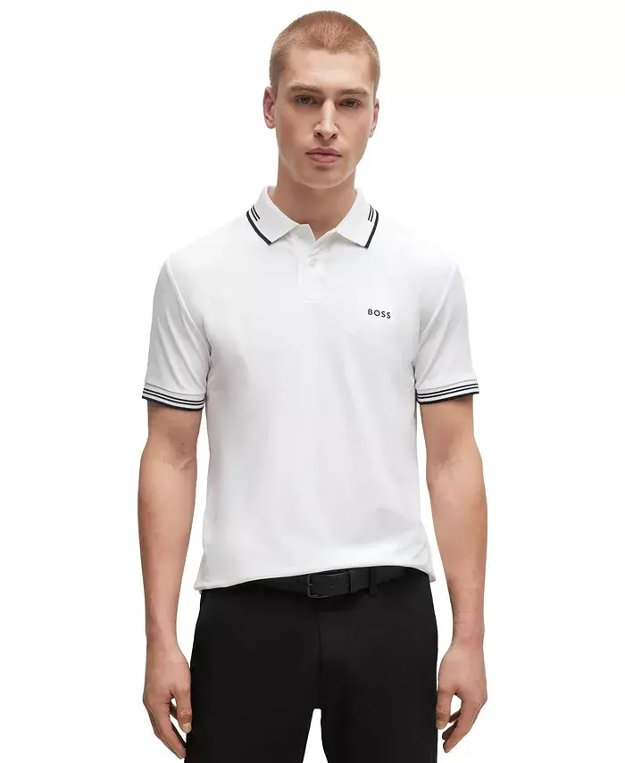 A contemporary polo shirt cut to a defined fit by BOSS men's wear, created in stretch cotton with contrast stripes and branding. The model wears a size M and is 6'2" tall with a, 38" chest, 29" waist and 38" hips Slim fit Flat-knit collar Number of buttons: 2 Short sleeves Flat-knit cuffs Standard length Closure: Slip on 92% cotton, 8% elastane Machine wash Imported