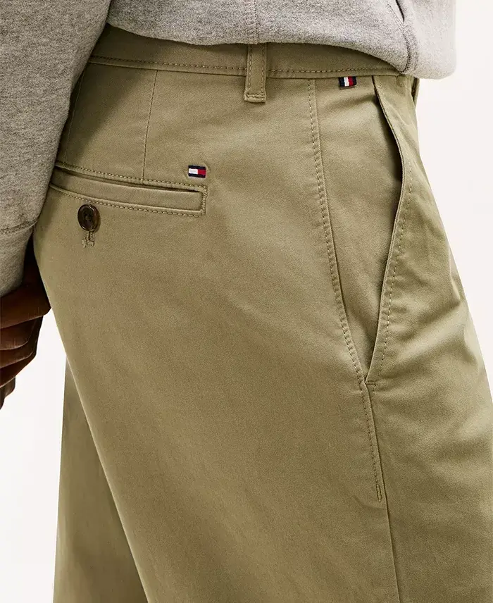 A smart, crisp pair of chinos is the hallmark of polished style, these versatile pants are a staple piece that can be worn to work with a button down shirt or at home with a polo. Tommy Hilfiger finishes these chinos in a stretch fabric for comfort and wearability, make this look your go-to staple for many a season. Our chino pant is fitted through the waist and thigh extending down to the ankle. Created for Modazone Classic flat front styling for a polished look Pockets at front and back for convenience Stretch fabric for added comfort Straight Fit: Tommy Hilfiger's straight fit stretch chino made to fit straight from the thigh to ankle Size 32 Waist measures 35 " Model is wearing a size 32x32 Button and zip closure Approx. inseam: 32'' 100% cotton Machine wash Imported