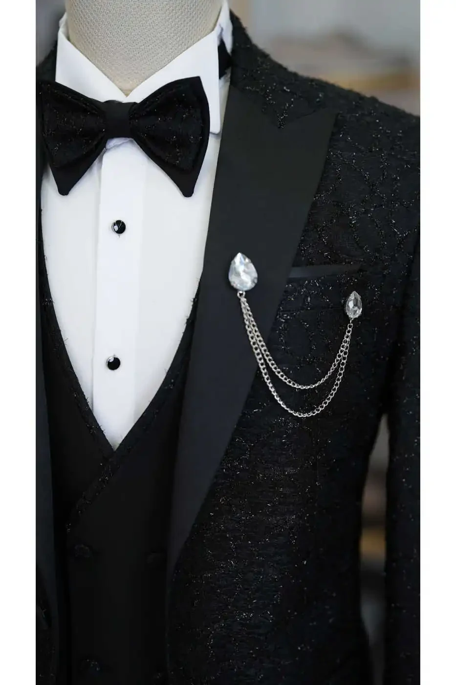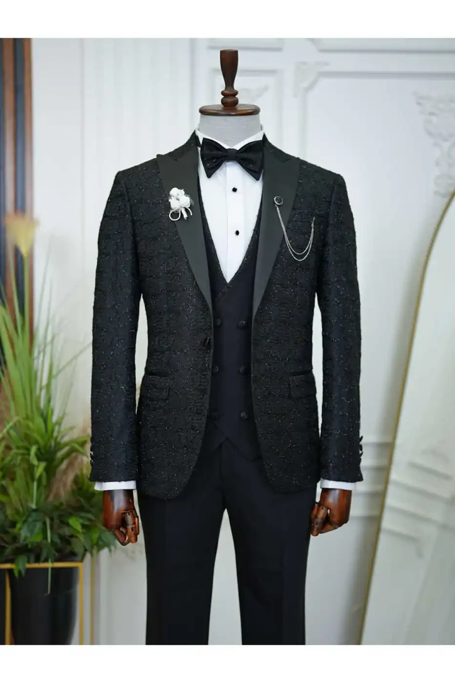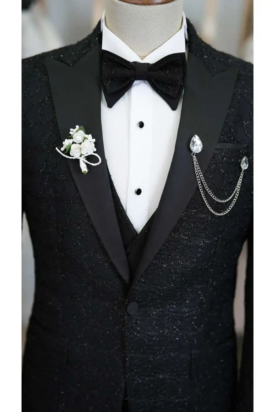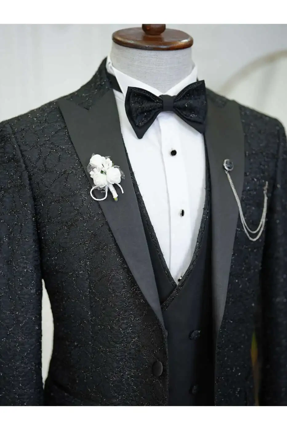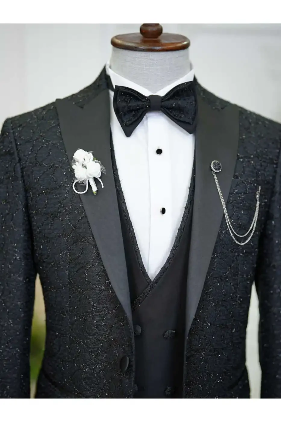 The jacket accentuates the body lines with its slim fit cut, while the swallowtail collar adds elegance to your style. The suit, complemented by a vest and pants, catches a perfect harmony with the bow tie on the elegance of the jacquard fabric pattern.
