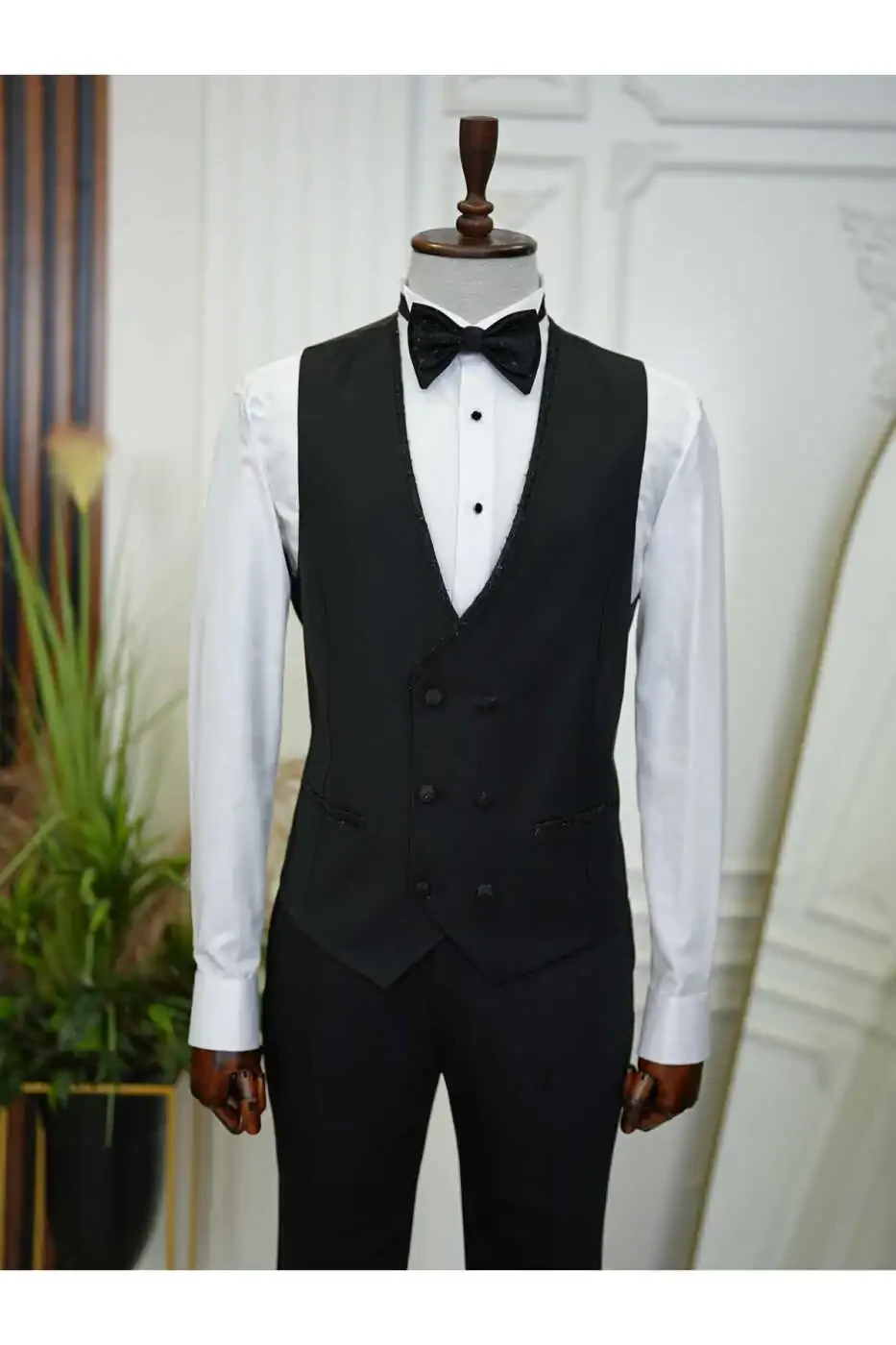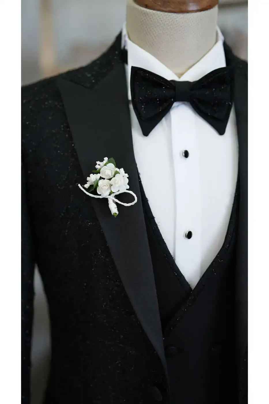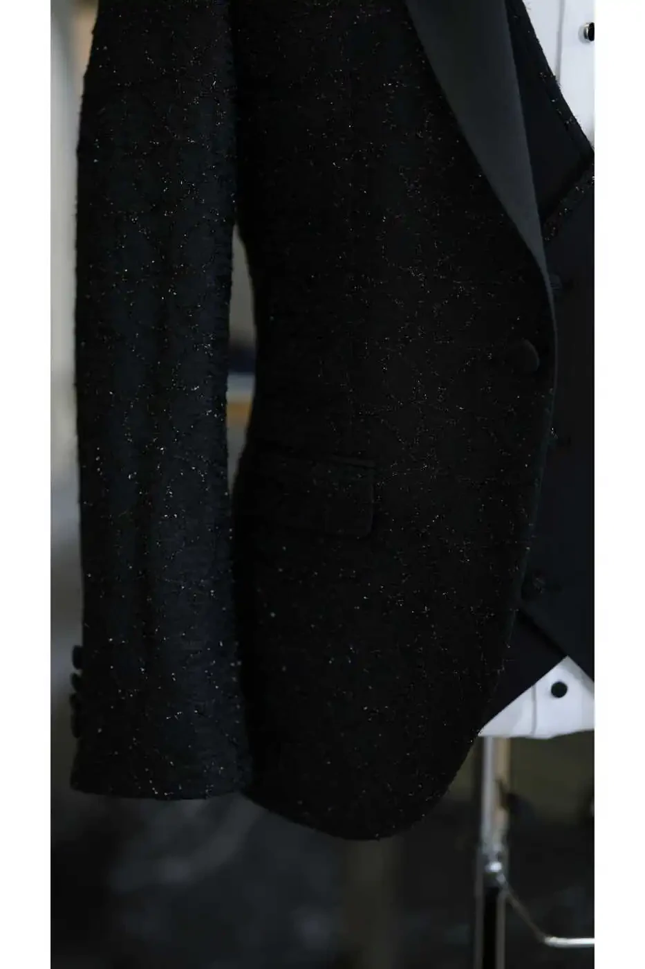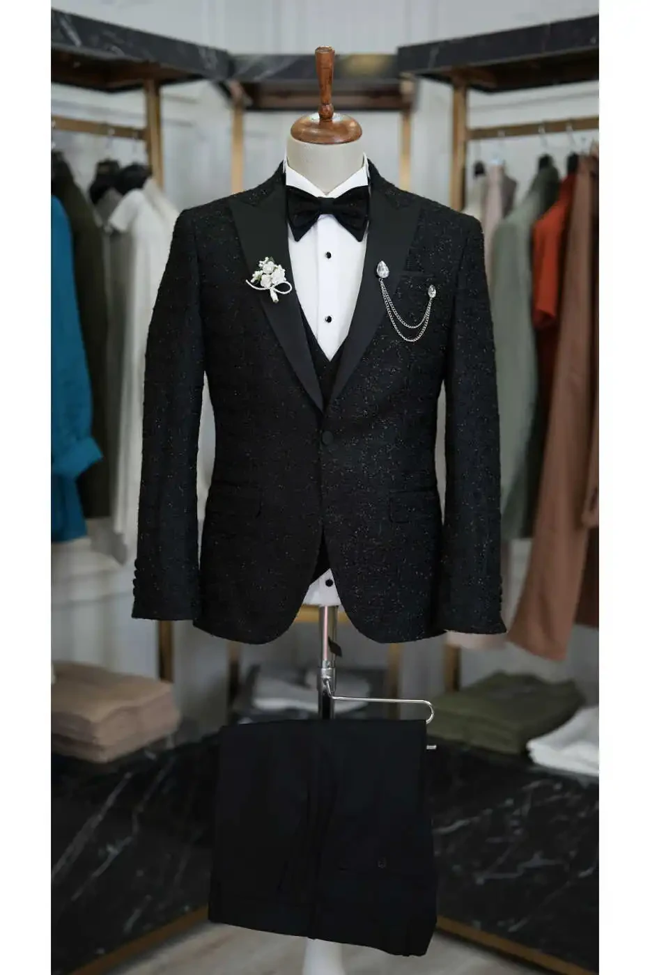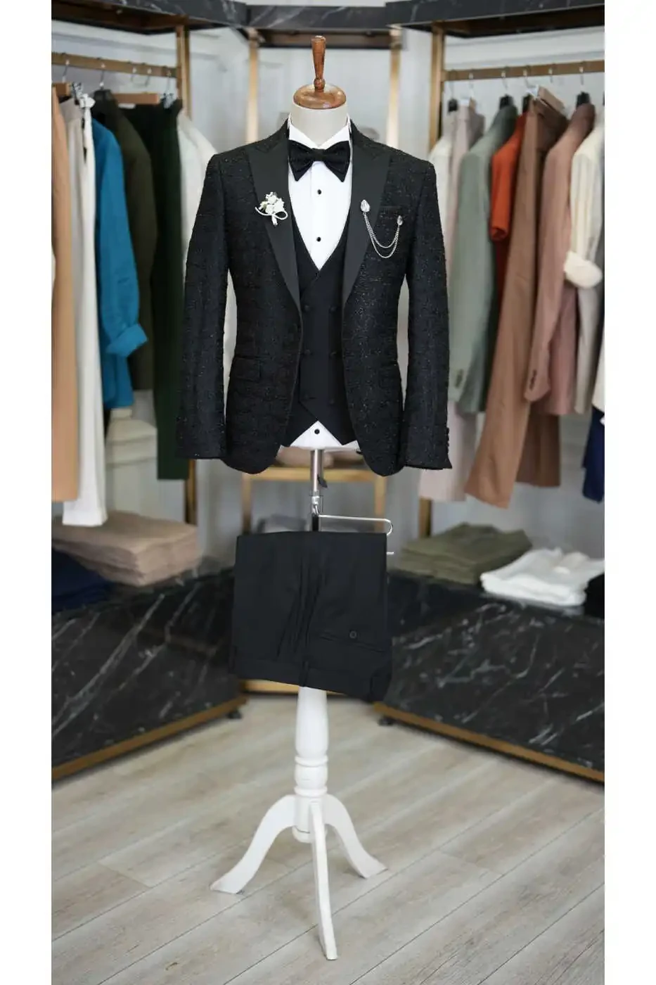 The jacket accentuates the body lines with its slim fit cut, while the swallowtail collar adds elegance to your style. The suit, complemented by a vest and pants, catches a perfect harmony with the bow tie on the elegance of the jacquard fabric pattern.