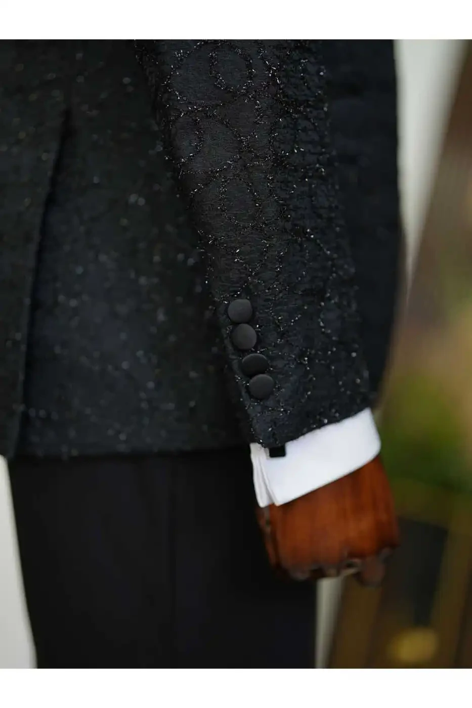 The suit, which stands out with its jacquard fabric pattern, swallowtail collar, Italian cut slim fit design, represents excellence in every detail.