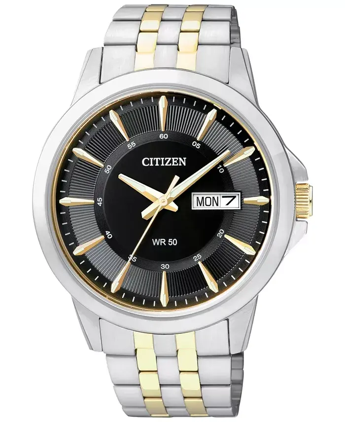 This men's two-tone bracelet features a stainless steel construction with a combination of polished and brushed finishes. It is 41mm wide and has a deployment clasp.