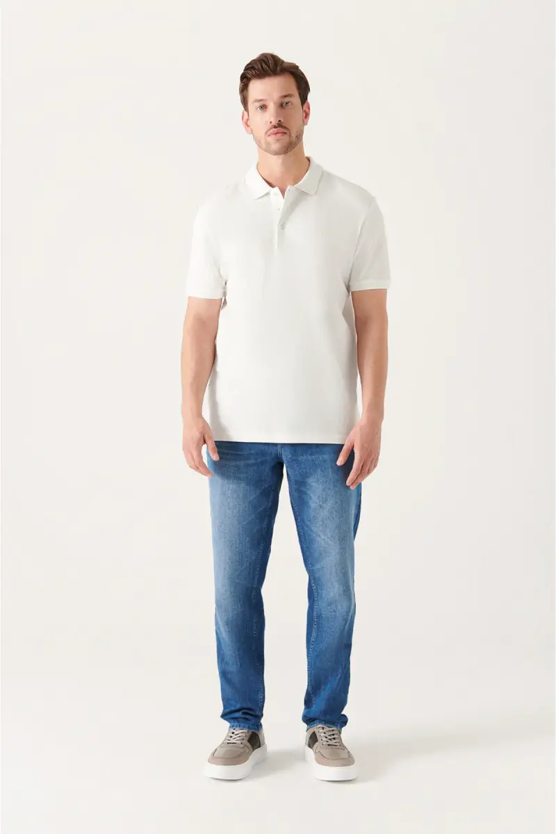Enjoy comfort without sacrificing your style even on hot summer days with the AVVA Men's White 100% Cotton Cooling Polo Neck T-shirt! This specially designed polo neck t-shirt offers a breathable and cooling experience all day long thanks to its 100% cotton pique fabric. With its regular fit standard cut, it fits your body perfectly, providing comfortable use while helping you achieve a stylish and modern look. This t-shirt, which you can easily choose for your special events as well as daily use, will be one of the indispensable pieces of your wardrobe. The three-button polo neck detail adds a classic and elegant touch, while the white color easily adapts to any combination. This t-shirt, produced with AVVA quality, is specially designed for long-lasting use. Please note that there may be slight color differences due to the light differences in studio shots. The model is 185 cm tall, has a chest of 100 cm, a waist of 79 cm and a hip of 99 cm, and the sample size is M. This information will help you choose the right size. Hurry to take advantage of the campaign price, order before stocks run out! Free returns are offered within 15 days with Trendyol assurance. You can visit the return conditions page for detailed information. Reflect your style and feel the comfort with the AVVA Men's White Polo Neck T-shirt!