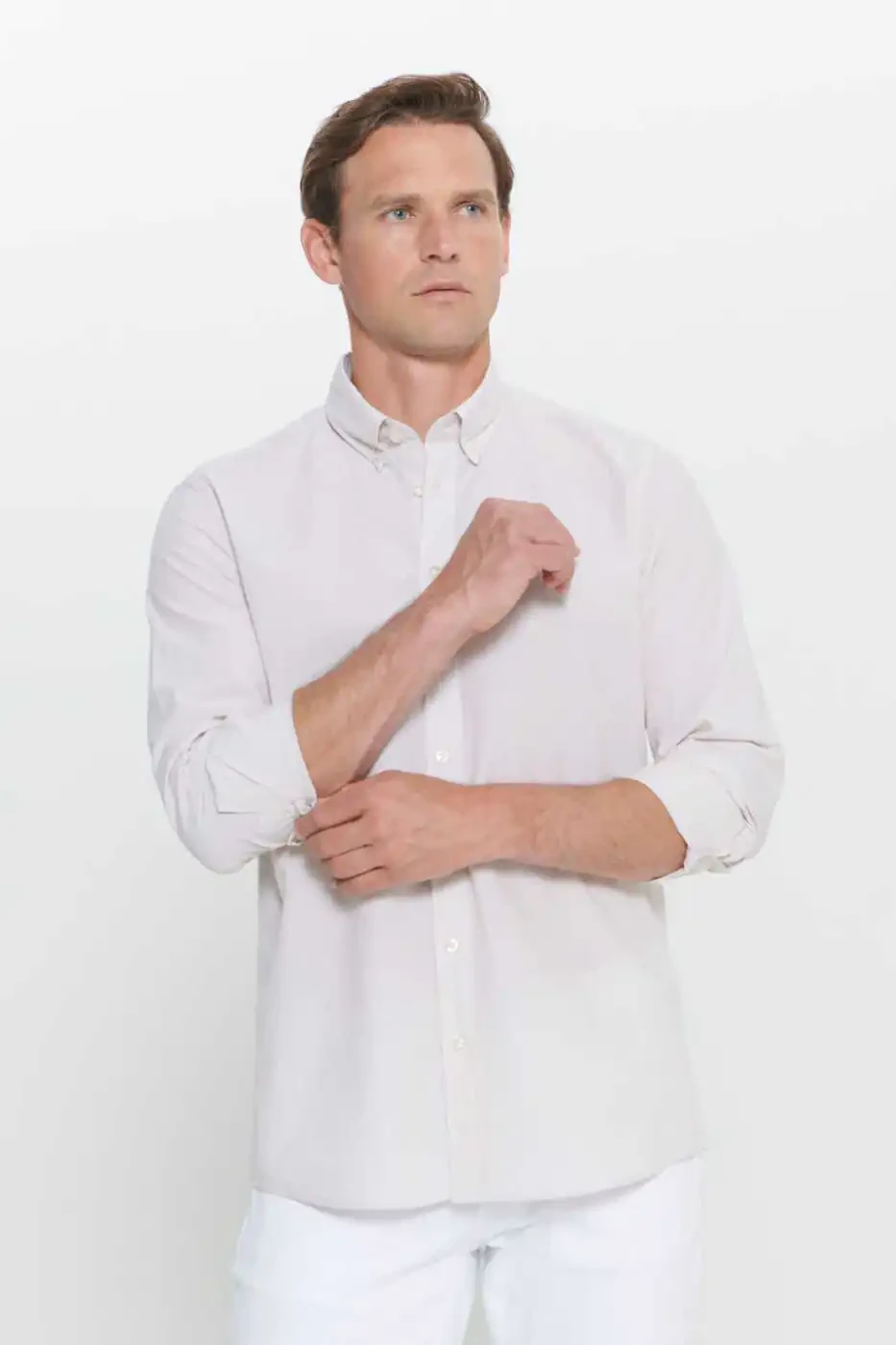 The Men's White-Beige Slim Fit Button-Down Collar shirt, which will be an indispensable part of your wardrobe, combines elegance and comfort. This special design, which reflects the style of the modern man, offers an ideal option for both daily use and special occasions. While allowing you to achieve a timeless look with its plain pattern and long-sleeved design, the slim fit molds to your body, creating a fit silhouette. The harmony of white and beige colors makes it easy to adapt to any combination. You will enjoy comfortable use all day long thanks to its high-quality 99% cotton and 1% elastane blend fabric. The natural breathability of cotton helps your skin stay comfortable by preventing sweating, while the elastane content adapts to your body without restricting your freedom of movement. The button-down collar detail adds a classic and stylish touch to the shirt, and you can personalize your style by combining it with different ties and bow ties. This shirt is an excellent choice for men who want to look stylish and well-groomed in business life, special events or weekend activities. You can create a casual style with jeans or a more formal look with fabric trousers. You can also complete your style by matching your accessories. The M size on the model can give you an idea of how the product will look on you. Model measurements: Height: 1.88 cm, Chest: 98 cm, Waist: 75 cm, Hips: 99 cm. You can examine the size chart to determine your own size and achieve a perfect look by choosing the correct size. The Men's White-Beige Slim Fit Button-Down Collar shirt is a candidate to be one of the most beloved pieces in your wardrobe with its quality material, stylish design and comfortable use features. It is an ideal choice for men looking for elegance and comfort together. This special shirt, which you can consider as a gift for yourself and your loved ones, is one of the best ways to reflect your style. Order now and take your elegance one step further!
