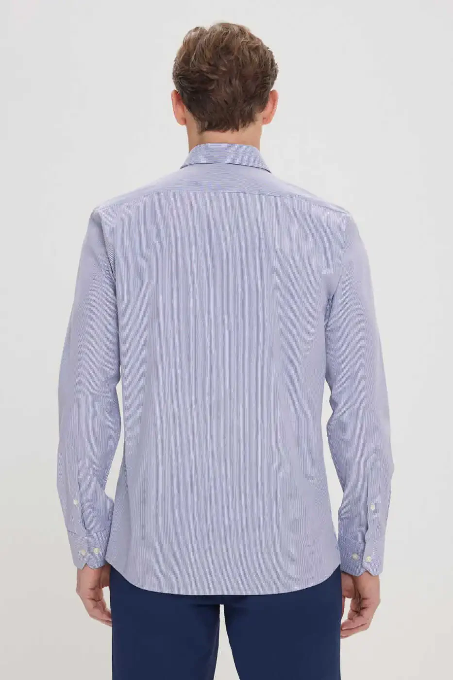 Men's White-Blue Slim Fit Narrow Cut Button-Down Collar Striped Shirt, 100% Cotton, Slim Fit, Button-Down Collar, Long Sleeve, Patterned, Casual/Daily. Here is the product description:Product DescriptionTake your style to the next level with the Men's White-Blue Slim Fit Narrow Cut Button-Down Collar Striped Shirt. This shirt is an ideal choice for men looking for a modern and stylish look. Thanks to its slim fit cut, it fits your body perfectly and creates a fit silhouette. The harmony of white and blue colors adds a fresh and dynamic air to the shirt, while the striped pattern adds a classic touch. The button-down collar of the shirt allows you to easily use it in both formal and daily combinations. Whether it's a meeting, a dinner, or your daily activities, you can always look stylish and well-groomed with this shirt. Thanks to its cotton fabric, it offers a comfortable use all day long. It allows your skin to breathe and prevents sweating. Its long-sleeved design keeps you warm in cool weather, while you can roll up your sleeves for a more comfortable use in hot weather. This shirt, which will be one of the indispensable pieces of your wardrobe, can easily adapt to different styles. You can create different styles by combining it with jeans, chino pants or fabric pants. When choosing shoes, you can prefer sneakers, loafers or classic shoes. With this shirt, you can always highlight your elegance and style. This shirt, which is one of the most trendy pieces of men's fashion, will be appreciated by stylish men. It is an ideal choice for those looking for both a quality and stylish option. The harmony of the white and blue colors of the shirt easily adapts to any environment. The striped pattern adds a different dimension to the shirt. The slim fit cut makes your body look fitter and more athletic. The button-down collar detail adds a classic touch to the shirt. Its long-sleeved design is suitable for all seasons. The cotton fabric offers a comfortable use all day long. You can always look stylish and well-groomed with this shirt. This shirt is for you to reflect your style and attract attention. This shirt, which will be one of the most loved pieces of your wardrobe, will always make you feel good. This shirt, which offers elegance and comfort together, is one of the indispensable of men's fashion.Product Features* 100% Cotton* Slim Fit* Button-Down Collar* Long Sleeve* Striped Patterned* Suitable for Casual/Daily UseAdditional InformationFollow the washing instructions for the product to have a long life. Do not use bleach. Iron at low temperature. Dry cleaning can be done. The product on the model is size M.