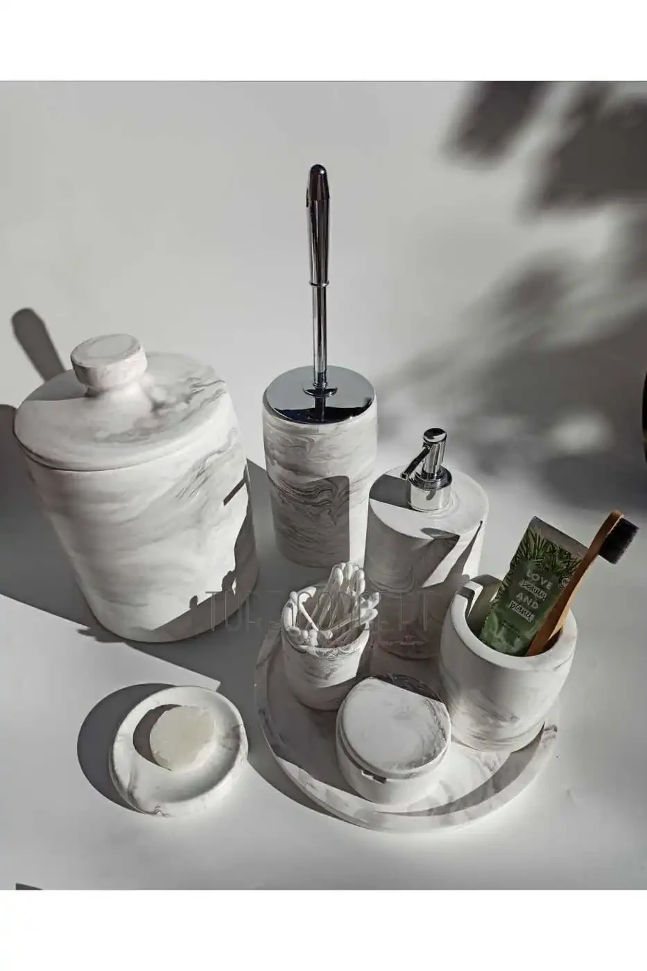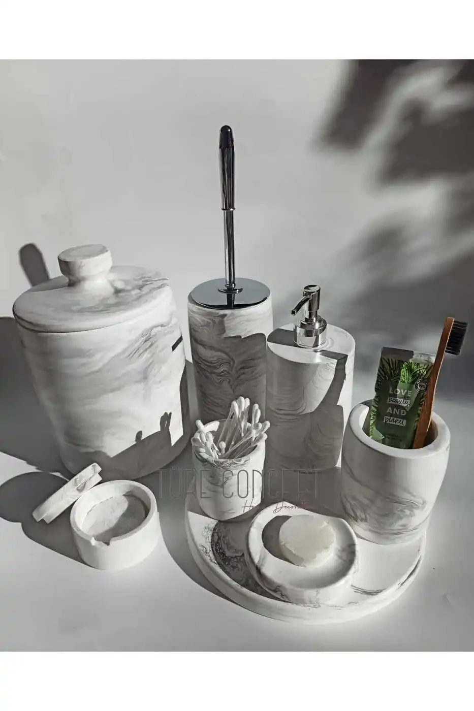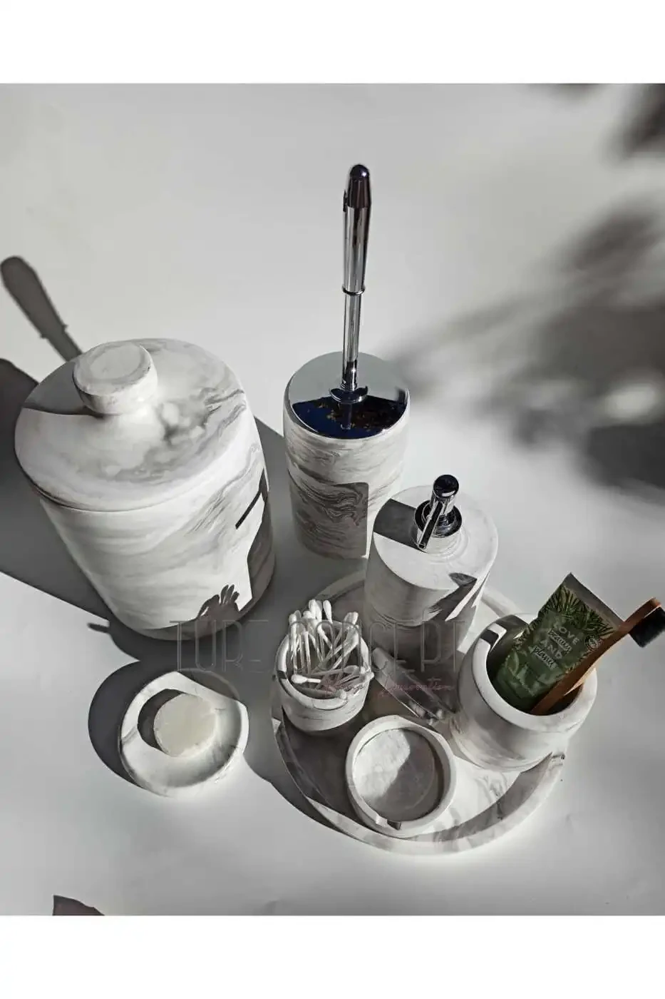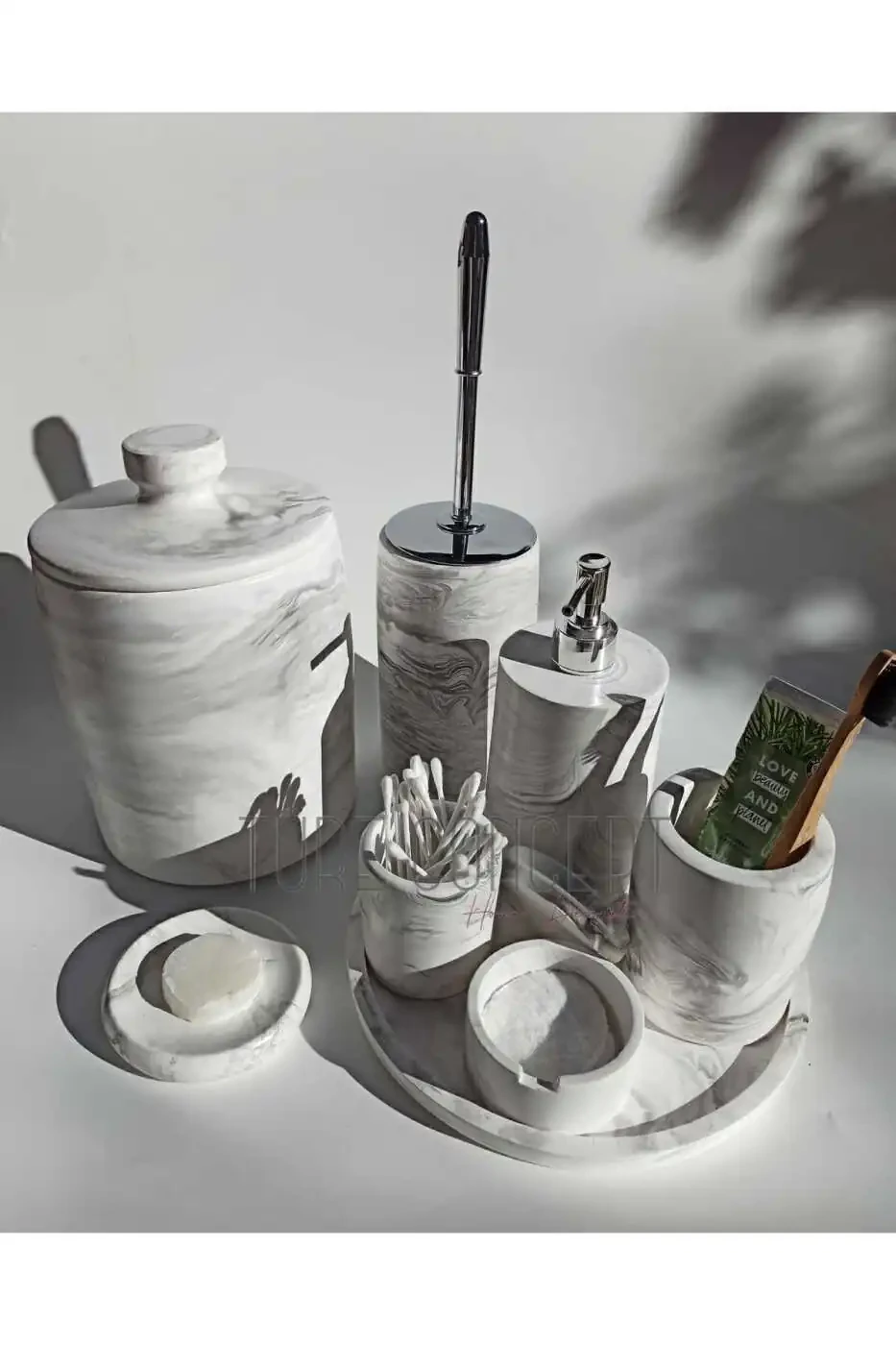 Estetik ve fonksiyonel bir banyo deneyimi sunan Mermer Görünümlü Banyo Seti, günlük banyo ihtiyaçlarınızı zarif bir şekilde karşılamak için tasarlanmıştır. Doğal mermerin sofistike güzelliğini yansıtan modern tasarımıyla, banyonuza şıklık ve konfor katacak. Bu seti oluşturan çöp kovası, tuvalet fırçası, tepsi, sabunluk, pamukluk ve çubukluk, günlük kullanımınızı pratik ve düzenli hale getiriyor. Mermerin zarif dokusunu andıran yüzey, banyonuzu göz alıcı bir ortama dönüştürürken, dayanıklı yapısı uzun yıllar boyunca kullanım sağlar. İster minimalist ister klasik bir banyo dekorasyonuna sahip olun, bu set banyonuzun estetiğini kusursuz bir şekilde tamamlar. Kaliteli malzemelerden üretilmiş bu set, zahmetsiz temizlik imkanı sunar. Banyonuzun merkezinde, kusursuz bir şekilde yer alan bu set, göz alıcı şıklıkla pratikliği bir araya getiriyor.