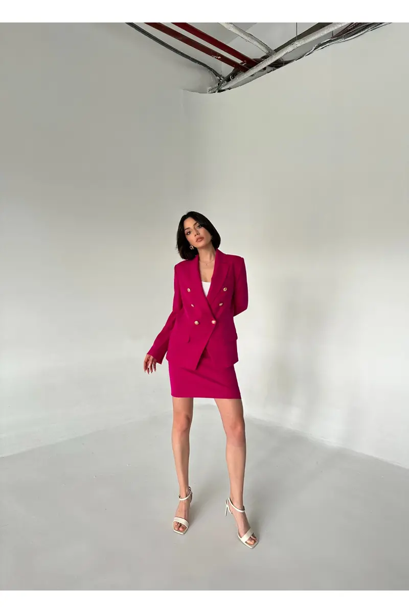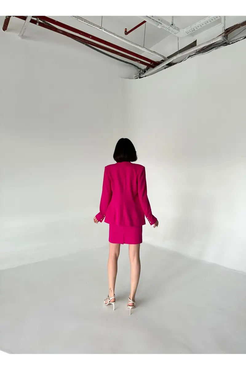 Şıklığı ve zarafeti bir araya getiren Metal Düğmeli Blazer İkili Etek Takım ile her ortamda göz alıcı bir stil yaratın. Zarif kesimi ve metal düğmeleriyle dikkat çeken blazer, şık bir görünüm sunarken, uyumlu eteğiyle feminen bir hava katıyor.