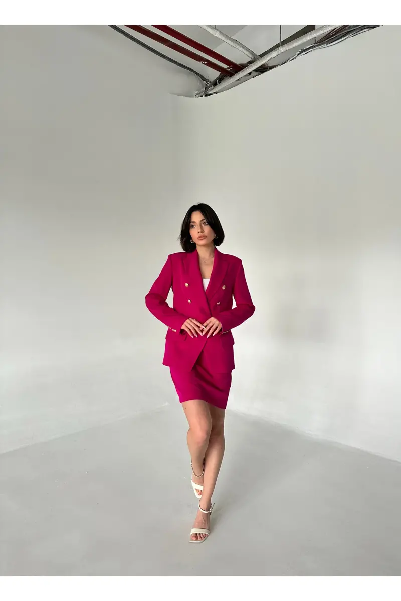 Kaliteli kumaştan üretilen takım, rahat bir kullanım sunarken aynı zamanda şıklığıyla da ön plana çıkıyor. Blazerin metal düğmeleri, takımınıza modern bir dokunuş katarken, eteğin zarif kesimi silüetinize mükemmel bir şekilde uyum sağlıyor.