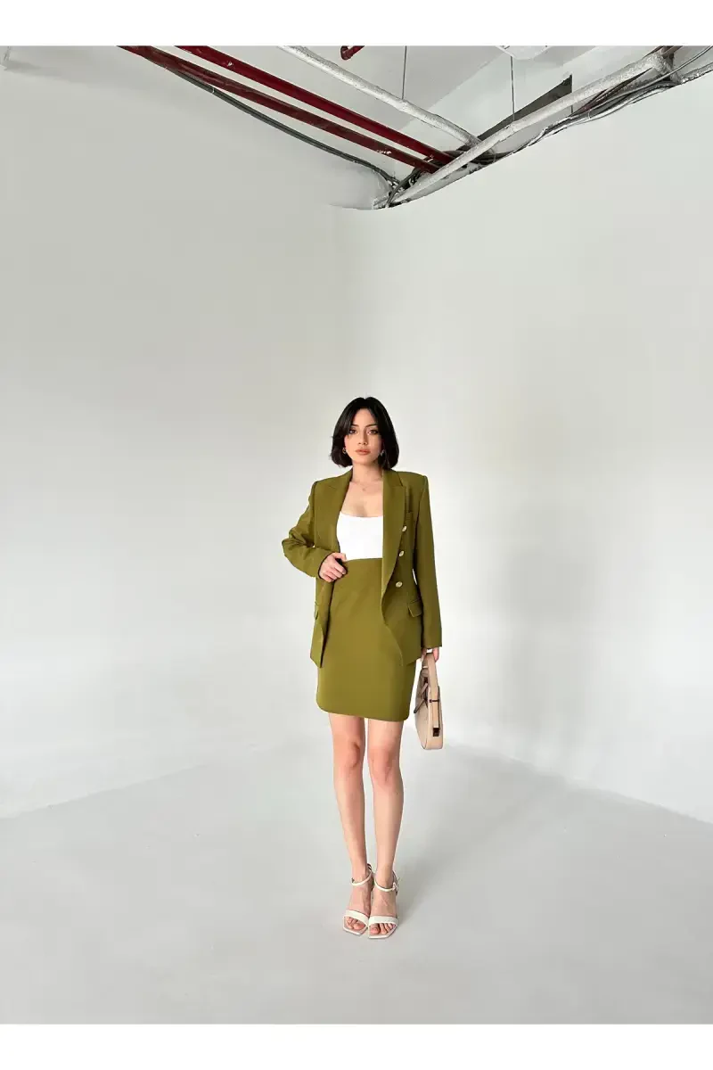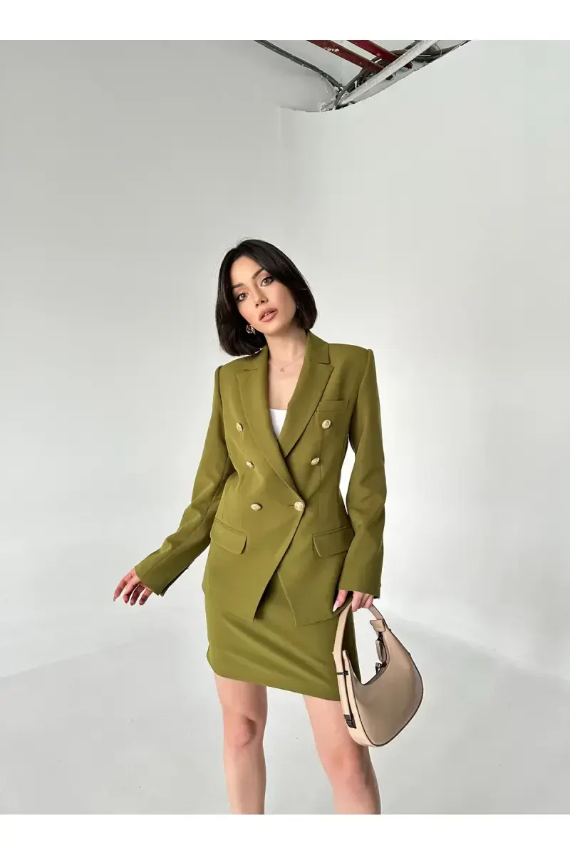 Nafislik va jozibadorlikni birlashtirgan Metal Tugmali Blazer Ikki Qismli Yubka To'p-to'pi, garderobingizning ajralmas qismiga aylanadi. Klassik blazer va yubka kombinatsiyasi bilan zamonaviy nafislikni taqdim etadigan bu to'p-to'p, kunning har bir daqiqasida o'zingizni o'ziga xos his qilishingizga imkon beradi.