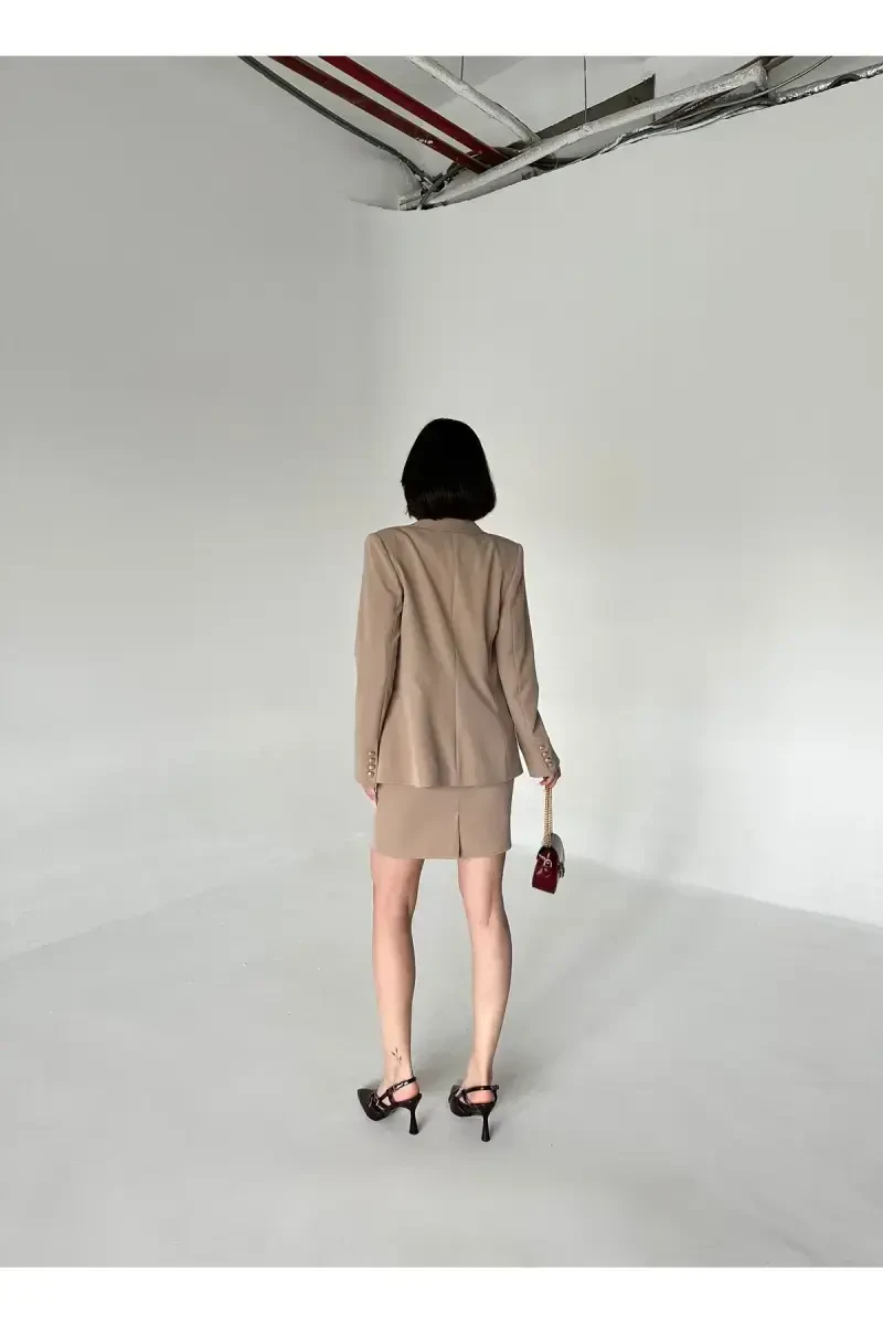 Blazer ko'ylagi metal tugmalari va keskin chiziqlari bilan zamonaviy ko'rinish berib, burmali yubka esa ayollikni his qildirishga yordam beradi. Ikki qismning uyg'unligi sizga nafis va sofistke uslubni taqdim etadi.
