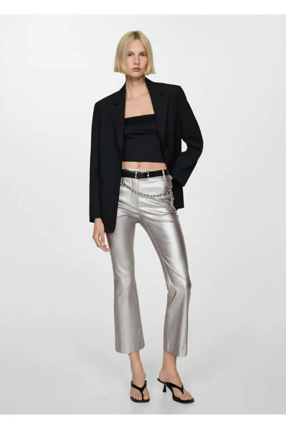 Make a statement in our Metallic Flare Pants. The cropped design showcases your ankles, while the flared silhouette lends an elegant and sophisticated touch. The metallic finish of these pants ensures you'll shine in any setting. Two patch pockets on the sides provide practicality for storing small items. Belt loops allow for a perfect fit with your belt, and a concealed button, hook, and zipper closure offer secure wear. Crafted from 76% viscose, 21% polyamide, and 3% elastane, the fabric is lined with 80% polyester and 20% cotton. A 100% polyurethane coating adds durability and luster to the fabric. With an inseam of 71.8 cm and side seam length of 98.6 cm, these pants are designed to fit perfectly and flatter your figure. Care must be taken when maintaining these pants, however. They are not suitable for washing, bleaching, dry cleaning, or tumble drying. Ironing should not exceed 110°C. A maximum of 10 units can be ordered. You have the right to return the product within 15 days.