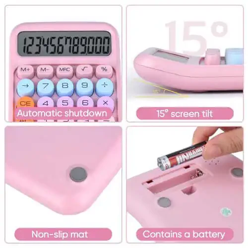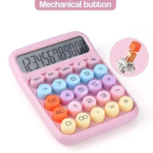**Механический кнопочный калькулятор, 12-разрядный большой ЖК-дисплей, большие кнопки, удобные для нажатия, красочный калькулятор для конфет, автоматический переход в спящий режим, с батарейкой. Для офиса, школы, дома. (розовый)****Особенности:*** **Механические кнопки:** Механические клавиши для быстрого и точного ввода данных.* **12-разрядный большой ЖК-дисплей:** Большой и четкий дисплей для легкой читаемости.* **Большие кнопки, удобные для нажатия:** Большие и цветные клавиши облегчают точный ввод данных.* **Автоматический переход в спящий режим:** Автоматический переход в спящий режим для экономии заряда батареи, когда не используется.* **Работает от батарейки:** Работает от одной батарейки AA для удобства.* **Многоцелевое использование:** Идеально подходит для офиса, школы, дома и всех других нужд расчетов.**Преимущества:*** Механические клавиши для быстрых и точных расчетов* Большой ЖК-дисплей для удобства чтения* Большие и цветные клавиши для точного ввода данных* Автоматический переход в спящий режим для экономии заряда батареи* Работа от батареи для удобства* Стильный и функциональный дизайн для любой обстановки**Характеристики:*** Материал: АБС-пластик* Тип дисплея: ЖК-дисплей* Размер дисплея: 12 разрядов* Батарея: одна батарейка AA (не входит в комплект)* Цвет: розовый**Комплект поставки:*** 1 х механический кнопочный калькулятор* 1 х руководство пользователя