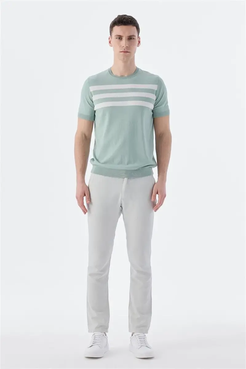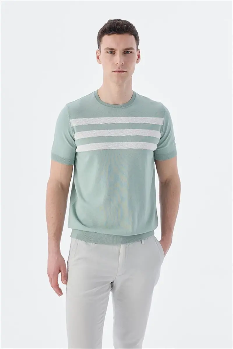 Добавьте изысканности своему стилю с помощью трикотажной футболки мятно-белого цвета Slim Fit с воротником-гольфом! Эта футболка, отличающаяся комфортом и элегантным видом, станет незаменимой вещью в вашей повседневной жизни благодаря качественным материалам и современному дизайну. Нежное сочетание мятно-зеленого и белого создает стильный и современный образ, а крой Slim Fit идеально подчеркивает фигуру. Воротник-гольф позволяет создать как классический, так и современный стиль, а эластичная и мягкая ткань обеспечивает комфорт на весь день. Эта футболка, которая подойдет для деловых встреч, встреч с друзьями, отдыха за чашечкой кофе и вечерних прогулок, станет одной из самых любимых вещей в вашем гардеробе. Ткань, изготовленная из 65% вискозы и 35% нейлона, отличается воздухопроницаемостью и износостойкостью, что гарантирует долгий срок службы. Мягкая текстура приятно соприкасается с кожей, обеспечивая ощущение комфорта на весь день. Кроме того, она проста в уходе. Можно стирать в машинке при 30 градусах и гладить, следуя инструкциям по уходу, чтобы футболка долго оставалась как новая. Не забудьте проверить свои размеры для идеальной посадки. Трикотажная футболка мятно-белого цвета Slim Fit с воротником-гольфом — идеальный выбор для тех, кто ценит стиль и комфорт.