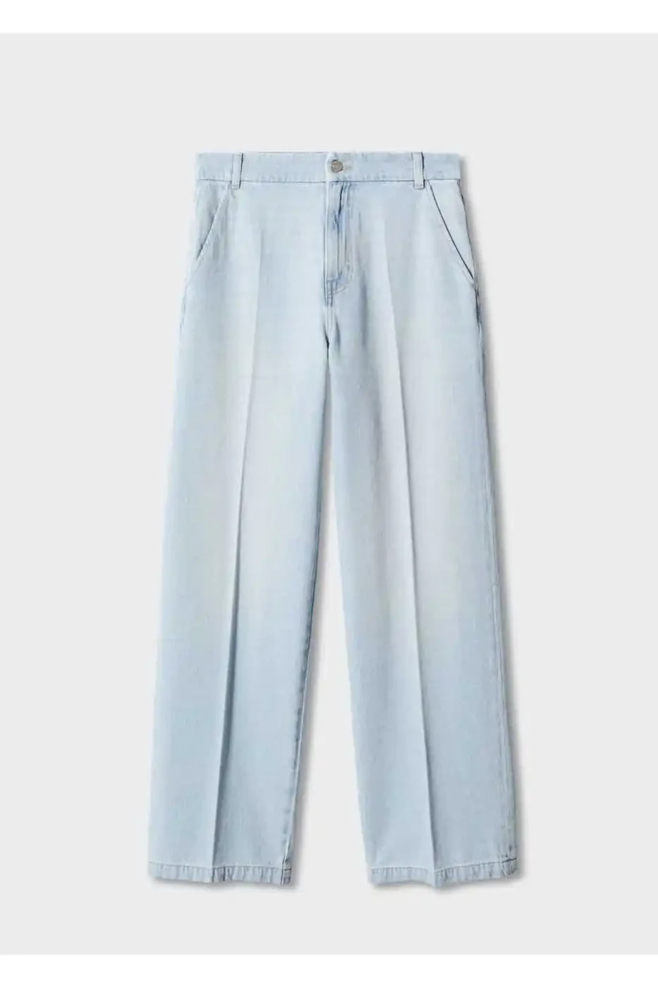 Denim-style cotton fabric, Straight model, Long model, Normal waist, Zipped and buttoned, Belt loops, Two pockets on the sides, Two patch pockets on the back, Inside seam 80 cm. , Model is 178 tall and wears size 36, Full length.