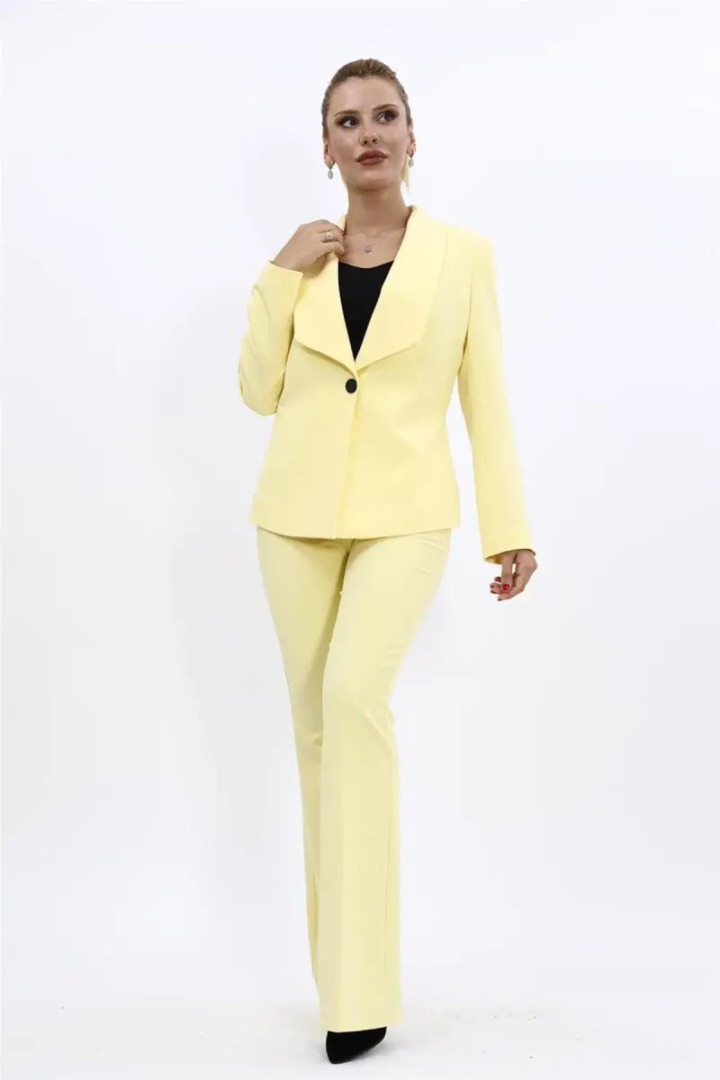 Our Midi Jacket & Flared Pants Suit is a modern combination designed in an eye-catching yellow color, which combines elegance and comfort, and is a candidate to be one of the indispensable pieces of your wardrobe. This suit, which offers a perfect option for both daily use and special events, will be the choice of bold and stylish women. Each piece of the suit attracts attention with its fitted cut and elegant details, while its comfortable fabric provides comfort all day long. This suit, which will allow you to make a difference in any environment with the energy and vibrancy of yellow, is an ideal choice for those who closely follow fashion.Product DescriptionOur Midi Jacket & Flared Pants Suit is specially designed for women looking for a modern and stylish look. This suit, which attracts attention with its eye-catching yellow color, allows you to create a bold and energetic style. The midi-length jacket fits the body with its elegant cut, while the flared pants complement your elegance without restricting your freedom of movement. This suit, which offers comfort all day long thanks to its high-quality fabric, is a perfect option for both daily use and special invitations. You can reflect your own style by combining the suit with different accessories and shoes. This suit, which will make your style speak in any environment, from business meetings to dinners, will be one of the most loved pieces of your wardrobe. The midi jacket offers a classic look with its carefully designed collar and button details, while the flared pants add dynamism to the suit with a modern touch. The energy of the yellow color adds vibrancy to every combination, while offering versatile use by matching the suit with different colors. This suit is not only stylish but also a comfortable and practical option. Thanks to the breathable structure of its fabric, it does not cause sweating all day long and allows your skin to feel comfortable. The seams of the suit are carefully made and offer long-lasting use. Our Midi Jacket & Flared Pants Suit is a special design that meets the needs of the modern woman and combines elegance and comfort. You can choose this suit to feel special and reflect your style. Remember, style is a form of expression and this suit will help you reflect your energy and confidence. This suit, where care and quality are felt in every detail, is a candidate to be one of the most valuable pieces of your wardrobe. Make a difference in any environment with this suit that combines elegance and comfort. Increase your energy with the vibrancy of yellow and let your style speak. Our Midi Jacket & Flared Pants Suit is not just a piece of clothing, but also a lifestyle. Increase your self-confidence by wearing this suit and enjoy every moment. This suit, which pushes the boundaries of fashion, is designed for you. Now is the perfect time to refresh your wardrobe and take your style to the next level!Product Features* Midi length jacket* Flared pants* Eye-catching yellow color* Fitted cut* Comfortable fabric* Careful stitching details* Breathable fabric structure* Versatile use* High quality material* Stylish and modern designAdditional InformationOur suit is offered with different size options. Please review the size chart and choose the size that suits you best. To ensure the product lasts longer, follow the washing instructions on the label. Accessories are not included in the price. Colors may vary depending on your screen settings.