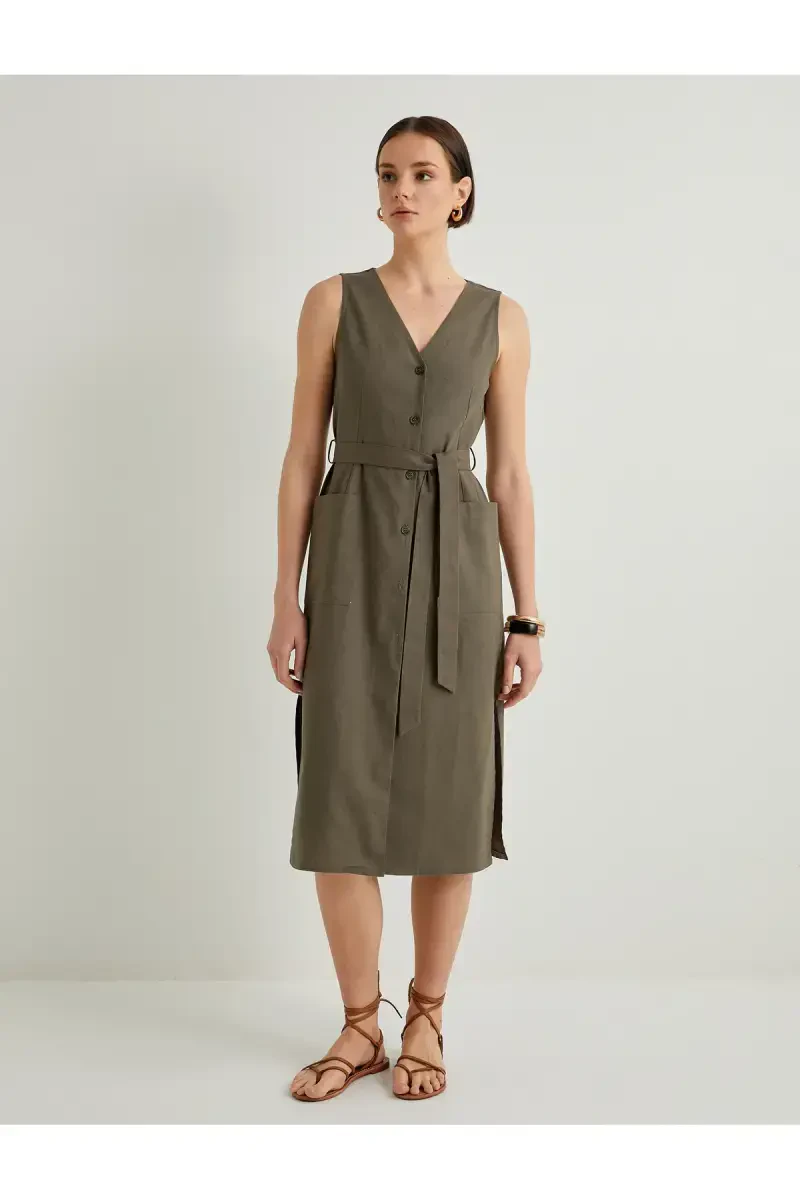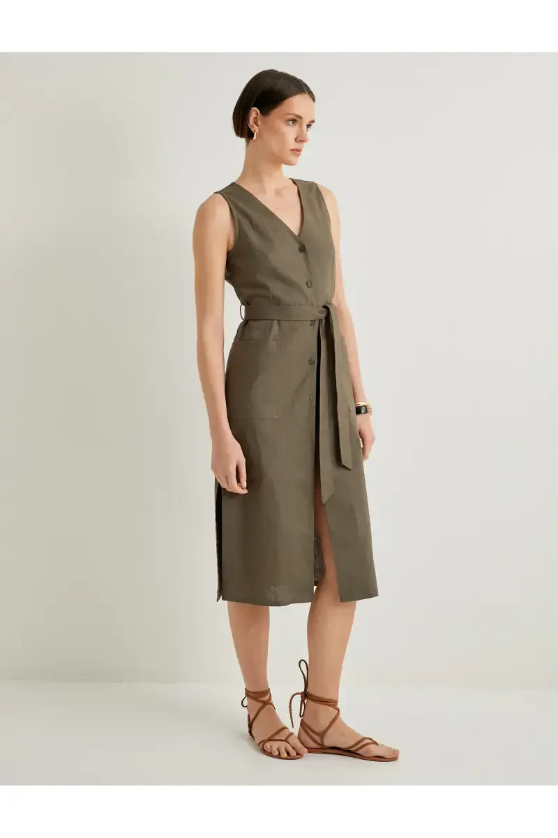 миди, воротник рубашки, с поясом, на пуговицах, смешанный лен, V-образный вырез, льняное платье, платье миди, летнее платье, женское платье