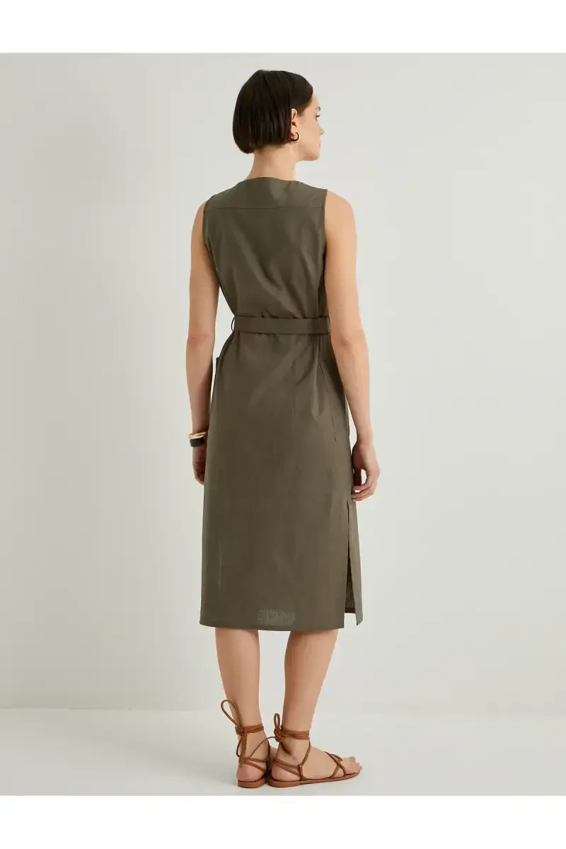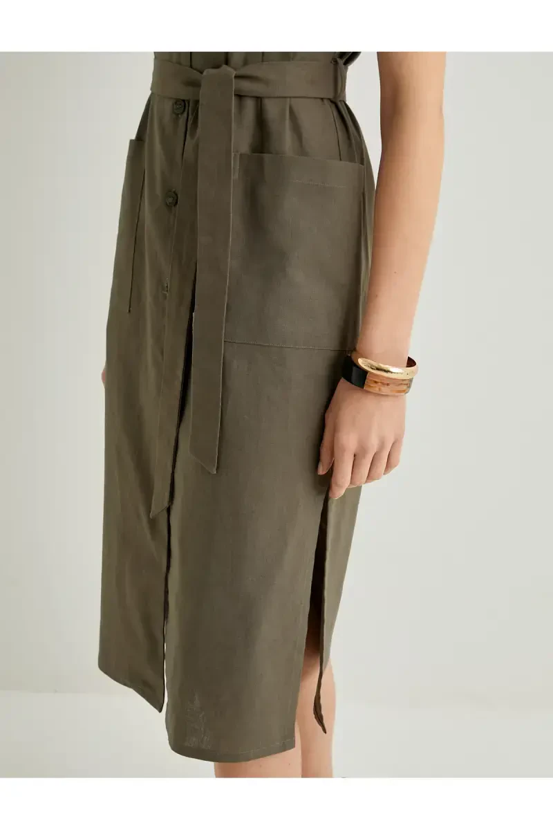 Миди-платье из льна с поясом | Рубашечный воротник V-образный вырез