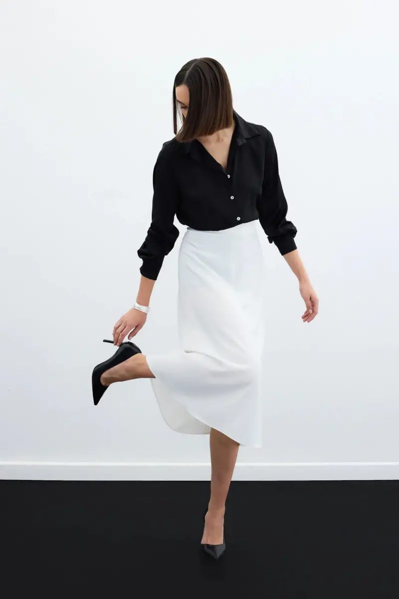 High waist, back zipper, unlined, midi length satin skirt. Length: 84 cm. The product on the model is size 36/S. Mannequin Measurements Height: 1.76, Bust: 83, Waist: 60, Hips: 90