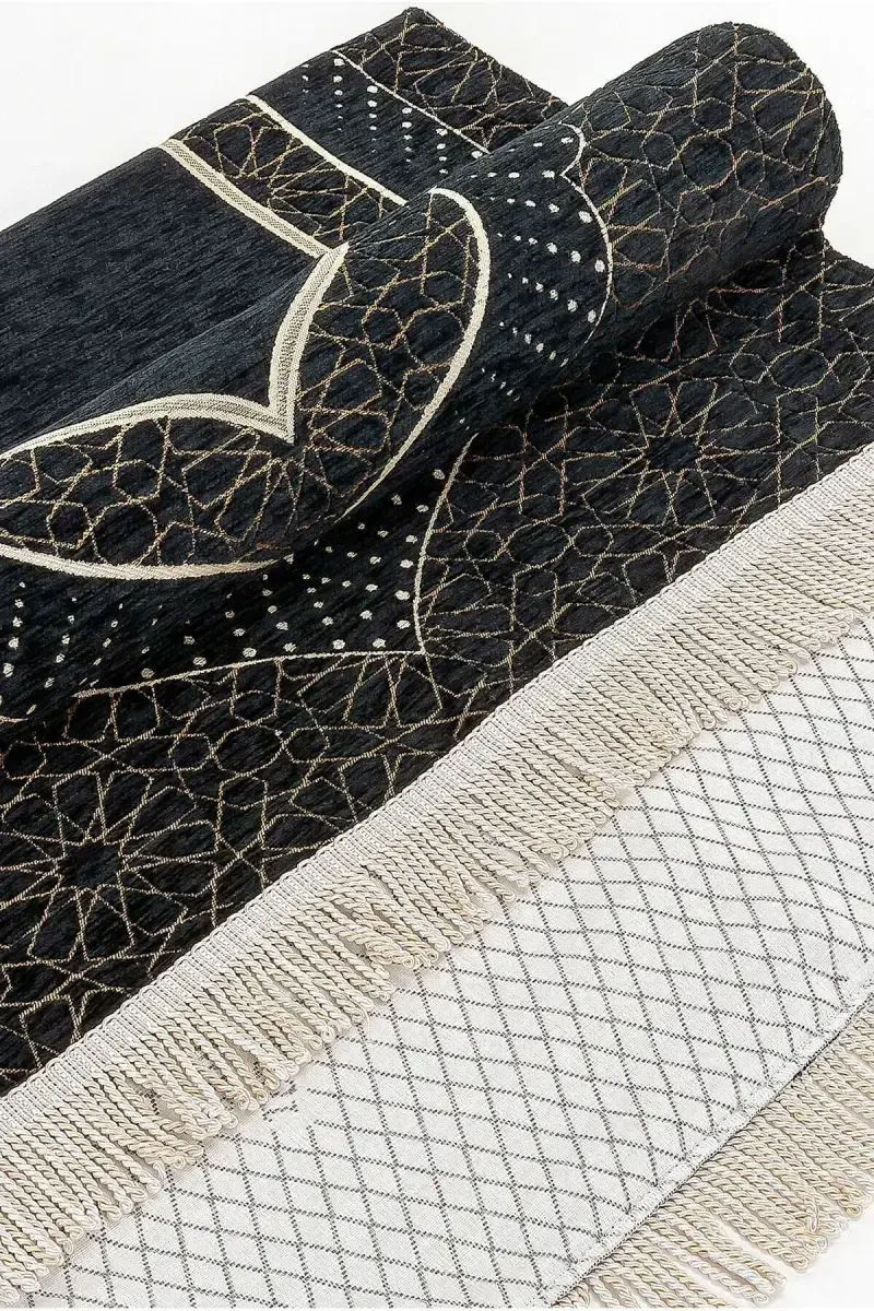 Mihrab Patterned Lined Chenille Prayer Rug - Black-Black is a special product that offers both comfort and aesthetics while performing your prayers. This prayer rug, which attracts attention with its stylish design and high-quality material, can accompany you in your daily use as well as on your special days. If you want to give a meaningful gift to your loved ones or acquire a special piece for your dowry, the Mihrab Patterned Lined Chenille Prayer Rug will be an excellent choice. The product is completely woven with chenille yarns and has no print or dye on it. Thanks to this feature, it is long-lasting and durable. With its non-shedding and non-pilling structure, it remains like the first day in every use. Thanks to its thin structure, it can be easily carried and stored, so you can keep it with you on your travels or when you have guests. The use of the prayer rug is not only a physical need, but also carries a spiritual meaning. It helps your body and clothes stay clean during prayer by providing a clean and smooth surface. At the same time, it increases your spiritual feeling by symbolizing that the place where it is laid is a special area while praying. It helps you focus your attention on your worship, while promoting discipline and respect. The mihrab pattern adds a separate elegance to the prayer rug, while the black-black color combination appeals to every taste. The soft texture of the chenille fabric provides comfort for your knees and skin. It is an ideal option especially for those with knee discomfort or those prone to allergic reactions. The dimensions of the prayer rug are 70 cm x 110 cm and its weight is 700 grams. These dimensions provide ease of use, while also offering practicality in terms of carrying and storage. The knitted tassels add an aesthetic touch to the prayer rug, enriching its appearance. It is also a suitable option for distributing gifts to your loved ones during baby showers, hajj and umrah visits. It offers both a useful and meaningful gift alternative. You can perform your prayers more peacefully and meaningfully with the Mihrab Patterned Lined Chenille Prayer Rug. With its high-quality material, stylish design and spiritual value, this prayer rug will be an important part of your life.